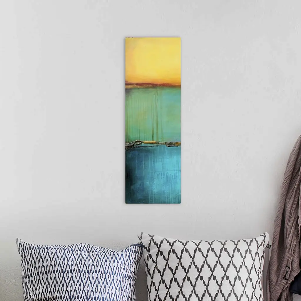 Giant, vertical contemporary art of three squares of color, some areas having drips or runs in color. Each square divided by a textured line, there are misplaced, random numbers in the top left and bottom left of the image.