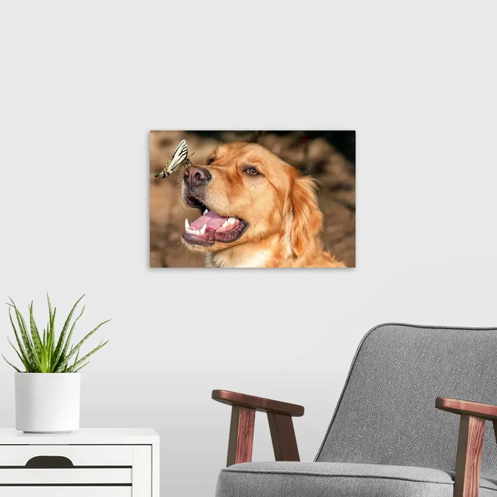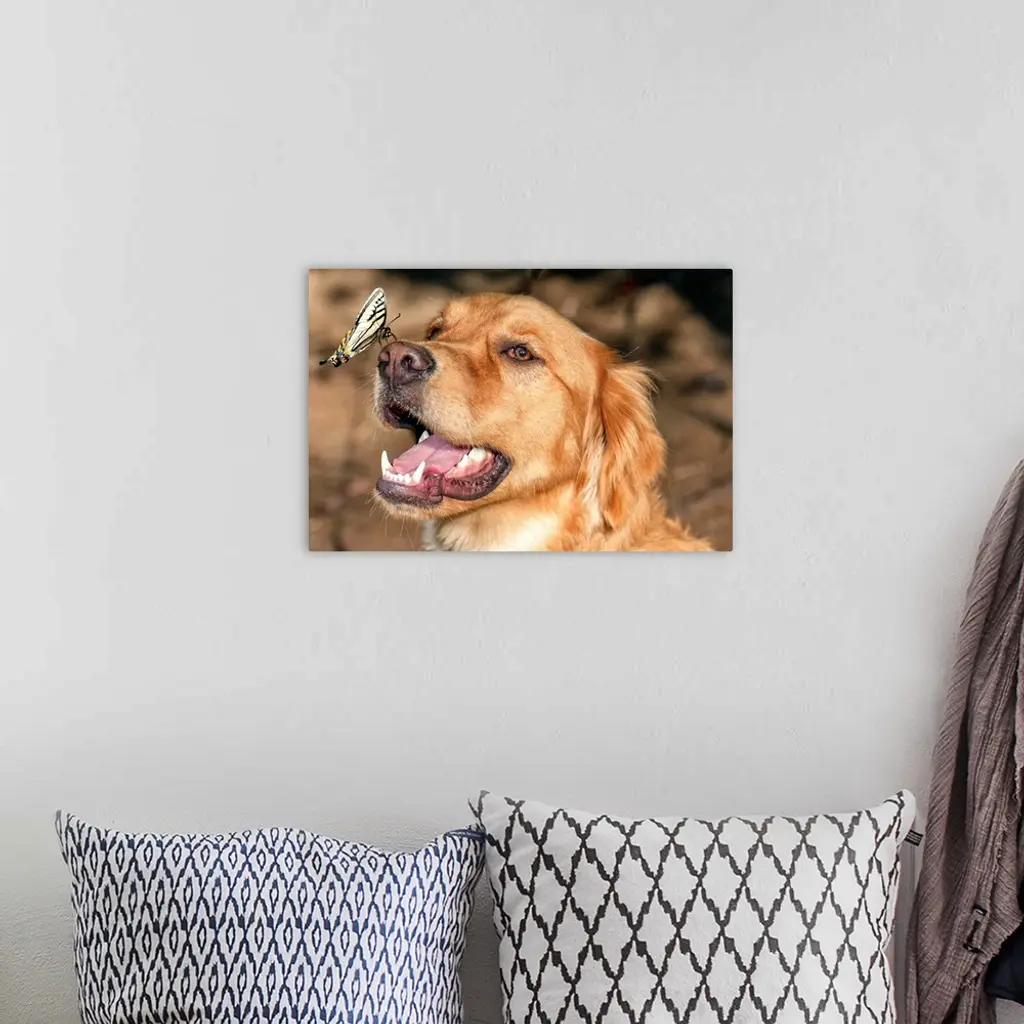 Butterfly making a safe landing on a happy dog's nose.