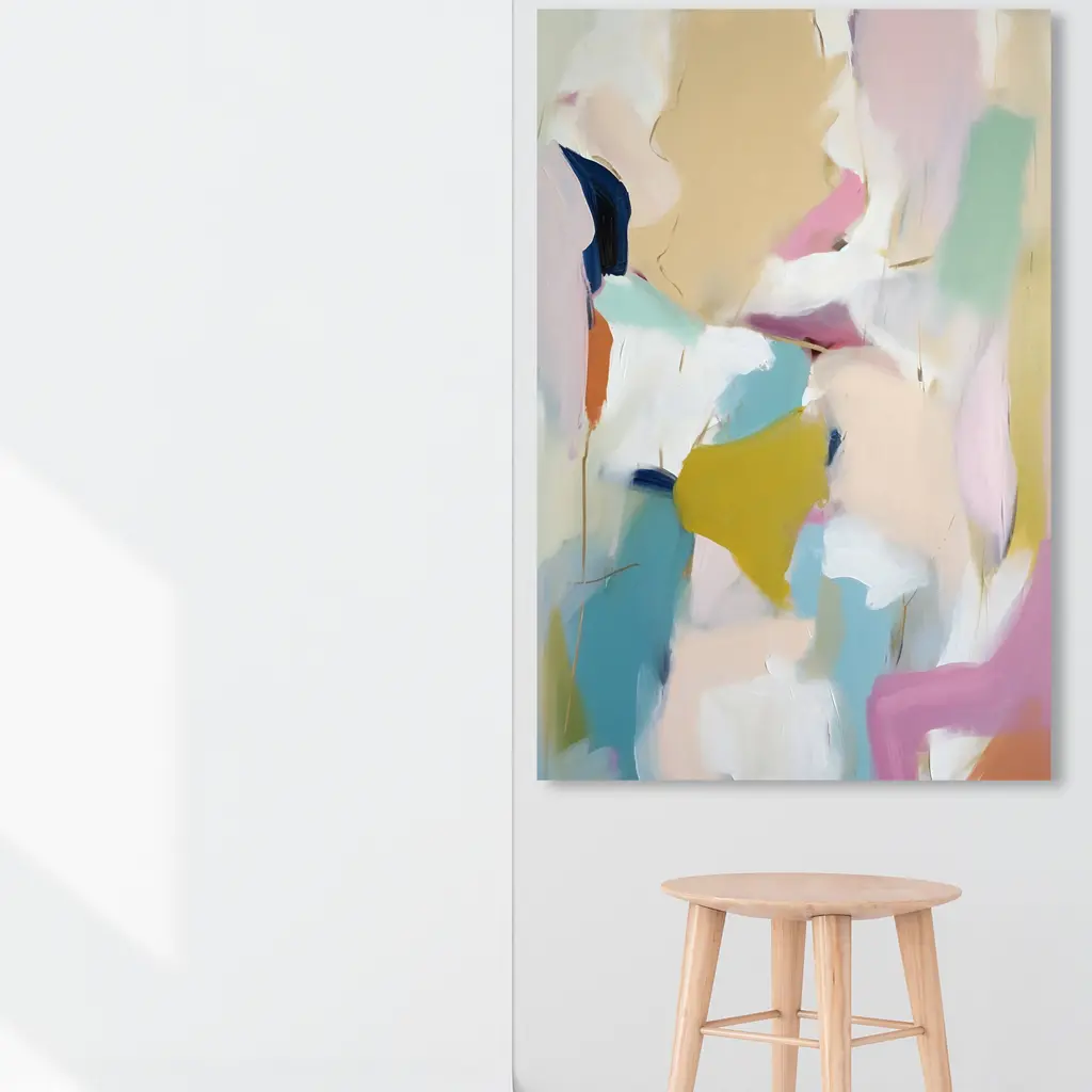 Featuring hand-painted embellishments, our exclusive painting features abstract shapes in neutral tones accented with vivid pops of color. Known for her abstract expressionist style, artist Alex Gerrard seeks to invoke an unexpected response. A third-generation artist, Gerrard describes their process as meditative and paints daily with their mother and two sisters.