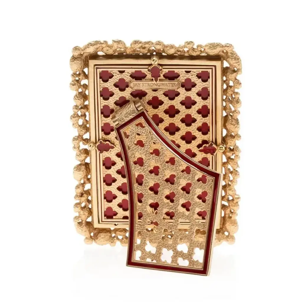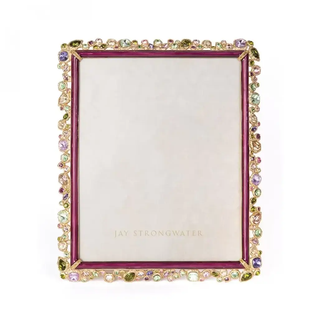 Surround your true love with a waterfall of Swarovski’s finest faceted large crystals stones in tones of Ruby, Scarlet and Siam wrapping around a slim enameled border. This Bejeweled Frame was casted in pewter, finished in 14K gold and beautifully painted in luminous ruby enamels by our finest artisans in Rhode Island. With our signature fleur-de-lis metal back plate and kickstand – this frame is truly beautiful from any view. Stands vertically or horizontal.