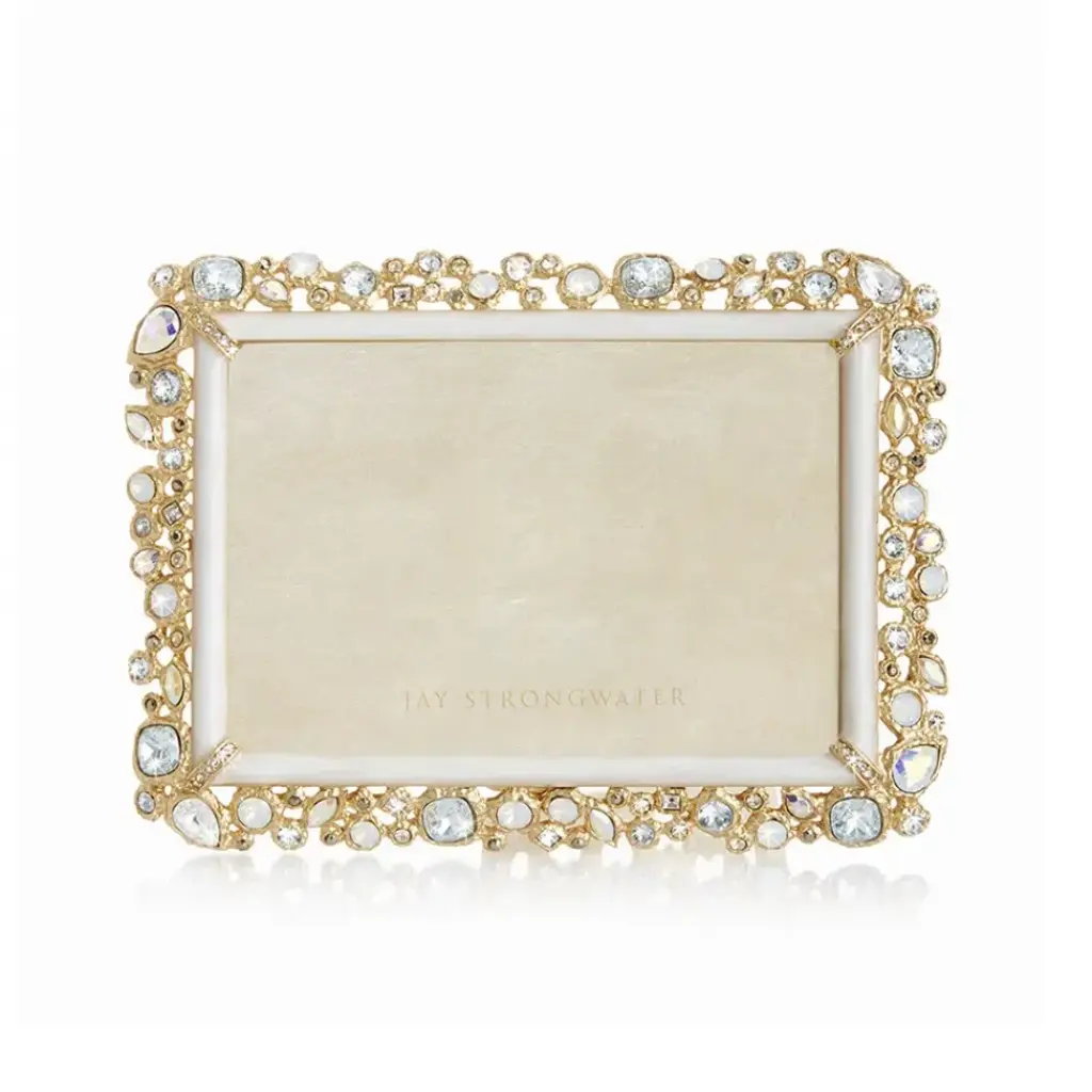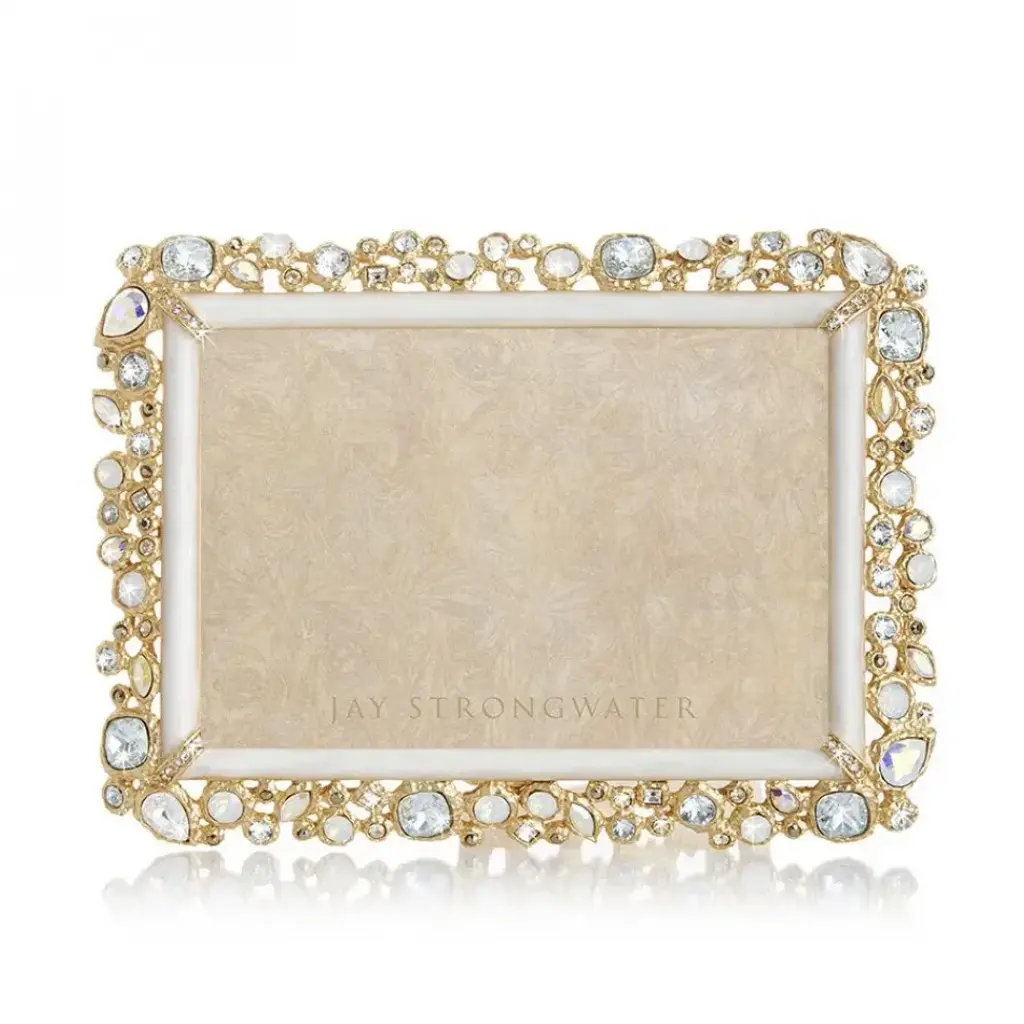 Surround your true love with a waterfall of Swarovski’s® finest faceted large crystals stones wrapping around a slim enameled border. This Bejeweled Frame was cast in pewter, finished in 14K gold and beautifully painted in luminous opal enamels by our finest artisans in Rhode Island. With our signature fleur-de-lis metal back plate and kickstand – this frame is truly beautiful from any view. Stands vertically or horizontal.