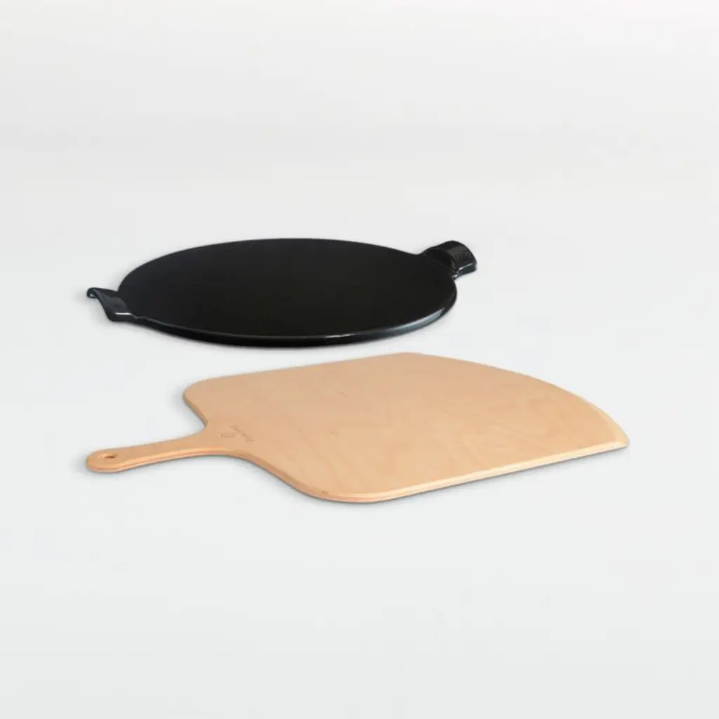 Perfect for the accomplished or aspiring pizza chef, this set pairs a handmade pizza stone with an Italian beechwood peel. Handmade of black-enameled stone with formed handles, the premium round pizza stone goes straight from fridge or freezer to oven or grill, making it as versatile as it is effective. Its glazed surface helps prevent charring and can be cut directly upon, and the entire stone cleans up conveniently in the dishwasher. With a short handle for compact storage, the pizza peel transfers your pizza onto and off of the baking stone in one smooth motion.Handmade in France since 1850, Emile Henry ceramics embrace modern technology to deliver products that can withstand all oven cooking temperatures, absorbing, distributing and retaining heat evenly.