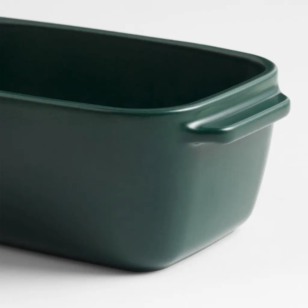 In this beautiful collection designed exclusively for Crate & Barrel, the classic and beloved ceramic bakeware of Emile Henry gets a modern update with softly curved organic lines and refined details. This loaf pan's clean, rounded corners and minimalistyet functionalhandles go from oven to table for serving quick breads, lasagna and loaf cakes. Crafted of Burgundy clay renowned for its superior heat retention, the pan is finished inside and out with an exclusive lush matte green glaze that resists chipping, cracking and thermal shock. All of the heirloom-quality pieces in our Emile Henry collaboration make extra-special housewarming, graduation and wedding gifts.Founded in 1850 in France, Emile Henry ceramics embrace modern technology to deliver products that can withstand high oven cooking temperatures, absorbing, distributing and retaining heat evenly.