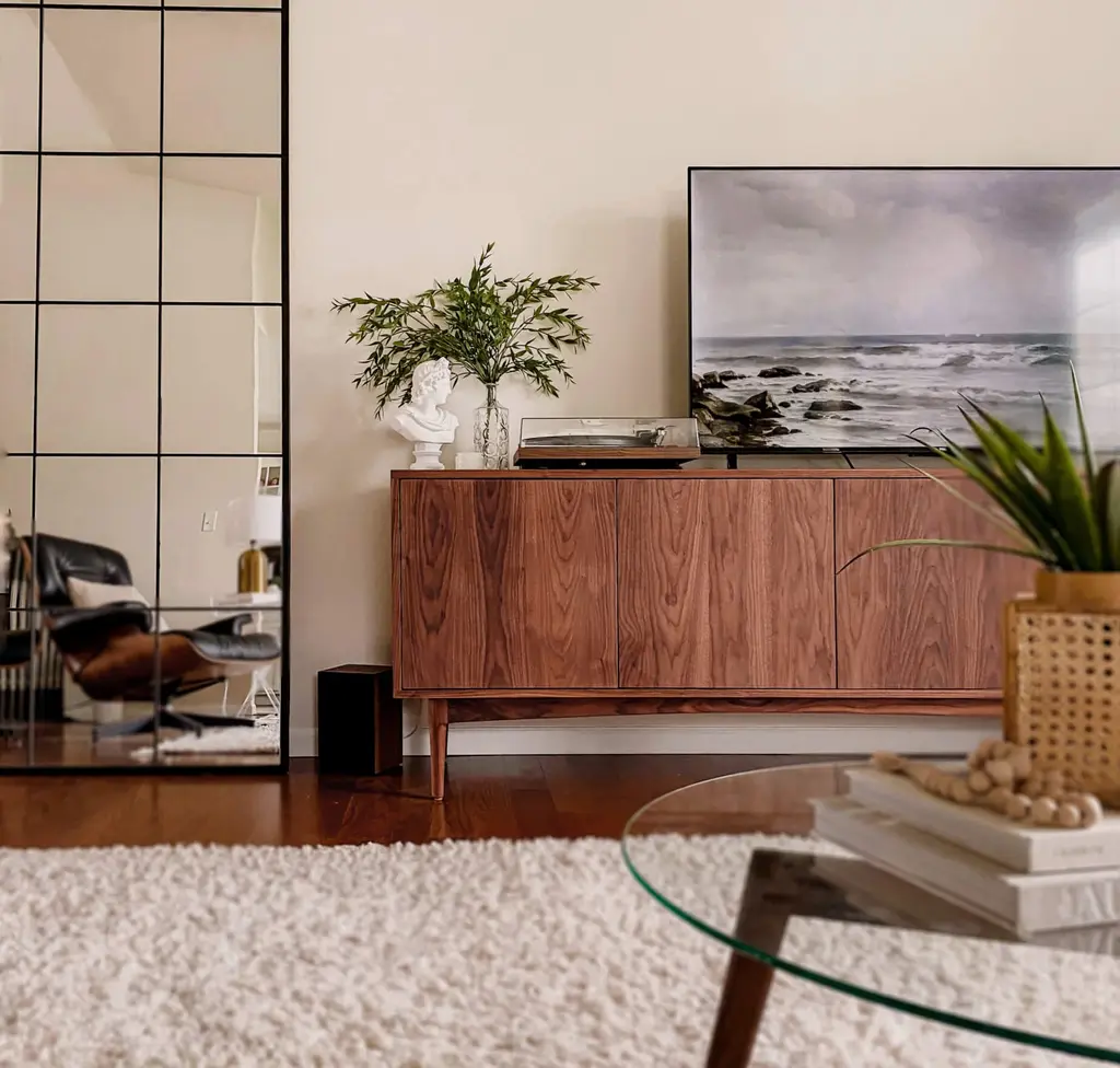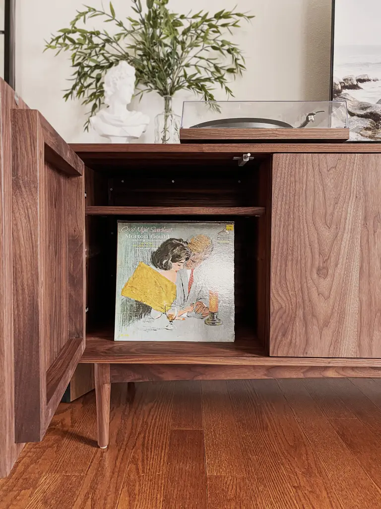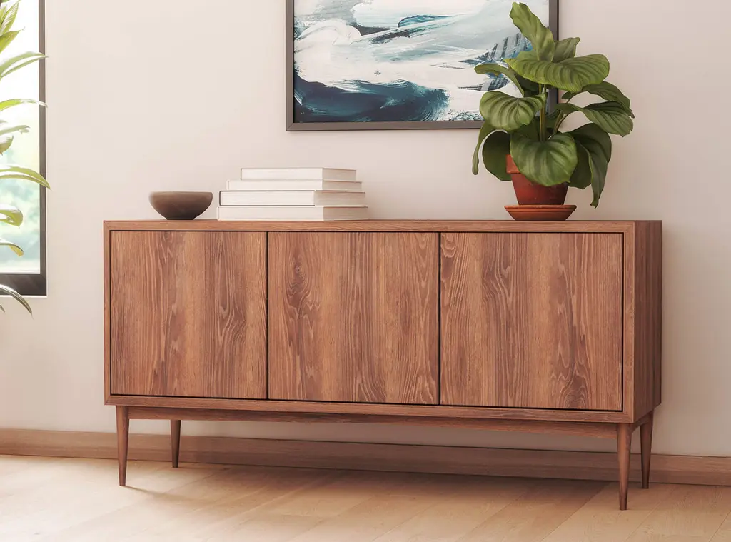 A modern classic. Crafted from gorgeous hardwoods, the Emilia 3-Door Credenza's classic joinery and gentle touch and push closure make organizing effortless, whether you're stashing away books, records, or your liquor collection. Also available in 2 and 4-door versions.Top and sides crafted in your choice of beautiful, 100% solid hard White Oak, Maple, American Walnut, or black-stained White Oak. For additional strength and lightness, FSC-certified, low-VOC CARB 2 compliant engineered hardwood is used elsewhere.