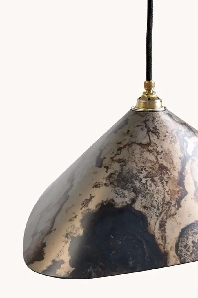 Emily is a series of gorgeous lamps with shades handmade of sheet steel. The source of inspiration for Emily is a work by German artist Andreas Gursky. In his series »James Bond Islands« he shows a digitally arranged group of islands in Thailand that seem to float in the ocean, although they are in fact only the tips of mountains Emily Oxid is the latest addition to our successful series of handmade metal shades. It is based on unique, weathered steel plates which, through the aging process, have developed extraordinary surfaces with different patterns. This makes each shade completely unique. To ensure that the patterns are permanently preserved, the shades are finished with a transparent powder coating. Up to 250V (Europe/UK Standard).