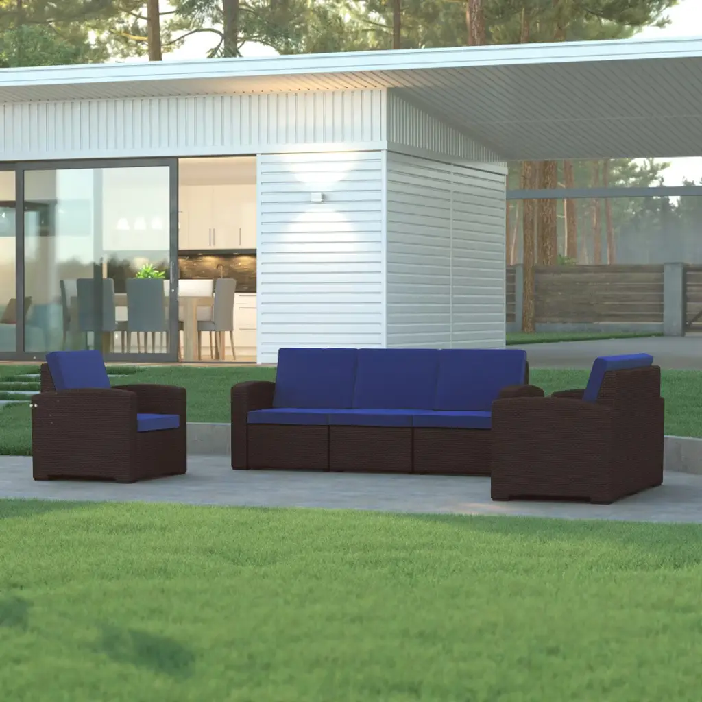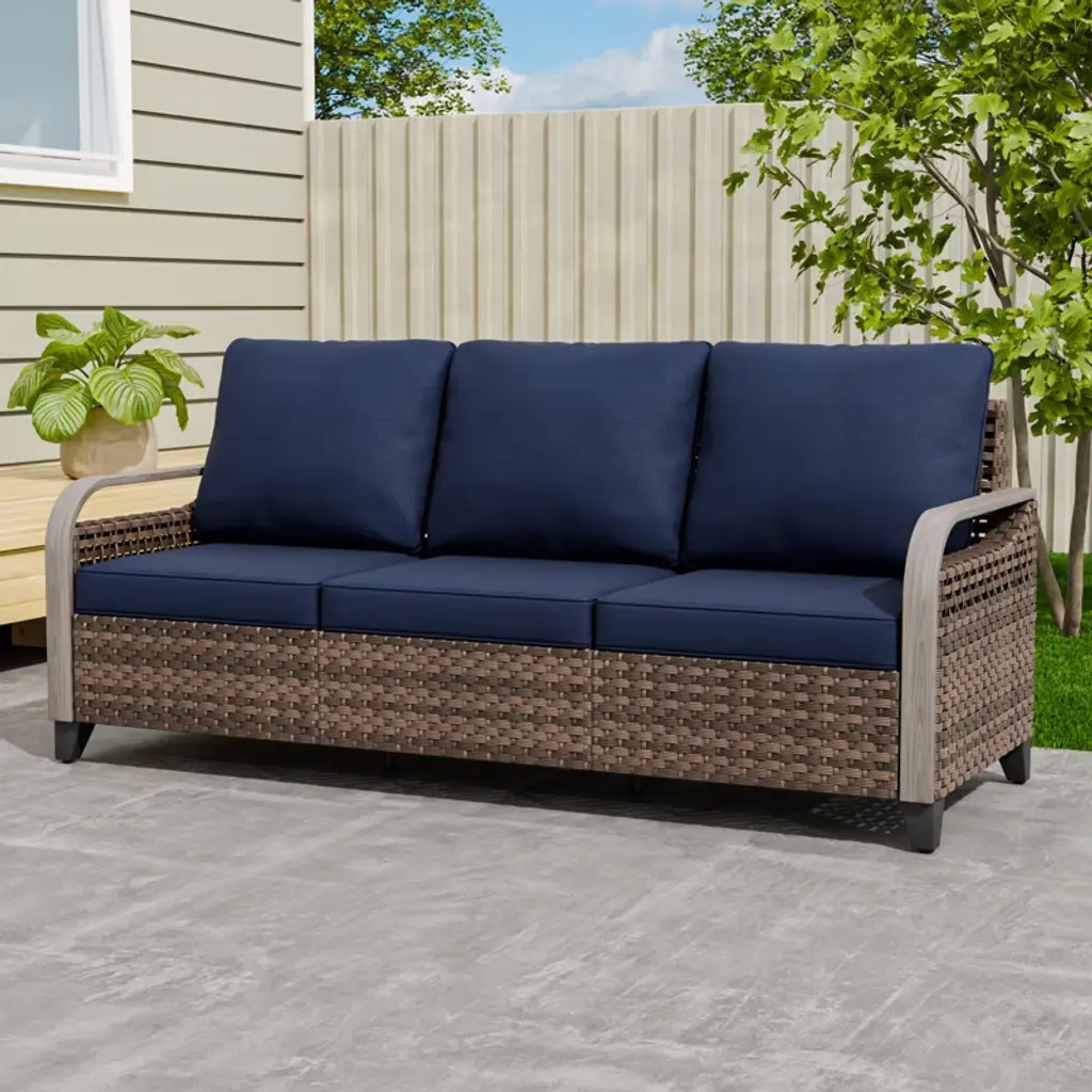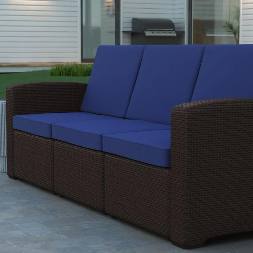Create an amazing outdoor space with this comfortable and stylish chocolate brown patio sofa. The durable resin frame offers a stylish appearance which replicates rattan. Deep seating enhances the comfort level. Navy all-weather cushions will hold up all season long. Clean spills with a water-based cleaner or the cushions are zipper removable for washing purposes. Curl up with your latest read, or just relax and enjoy the outdoors with family and friends and create lasting memories!