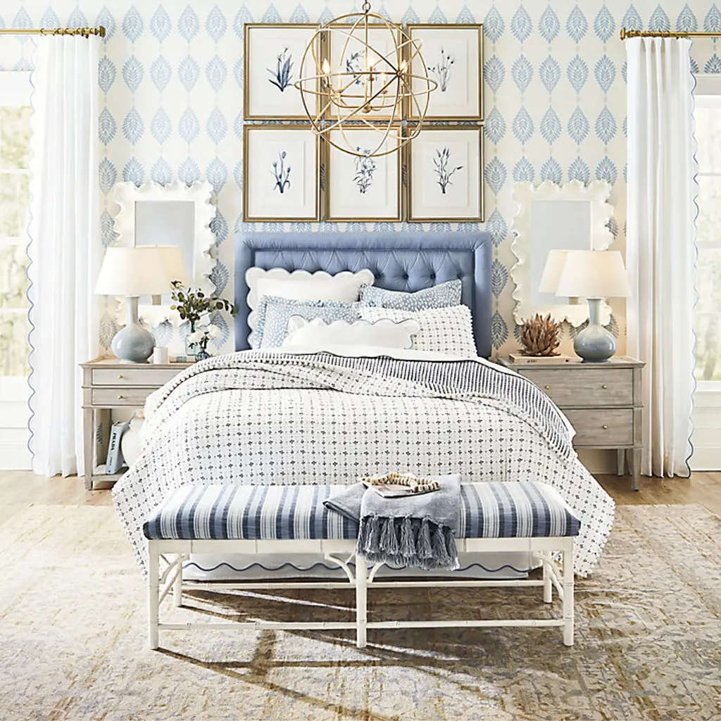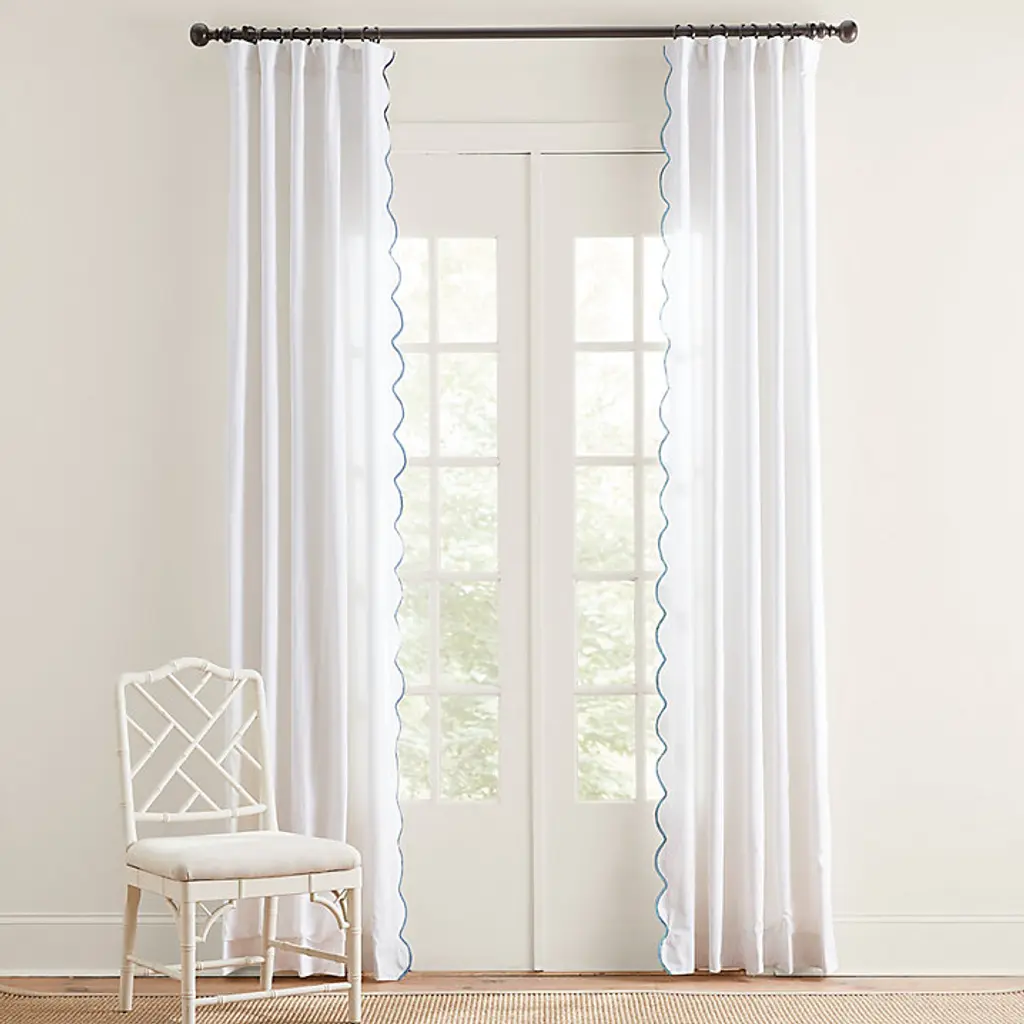 The pretty scalloped design was inspired by our popular Emma Bedding collection. The Emma Drapery Panels are made of white 100% cotton twill with gentle scallops along the inside edge trimmed in your choice of color. Use these whismsical window panels in the bedroom, living room or home office for a fresh look. Hang from 3" rod pocket or included pins. Emma Scalloped Edge Drapery Panel features: