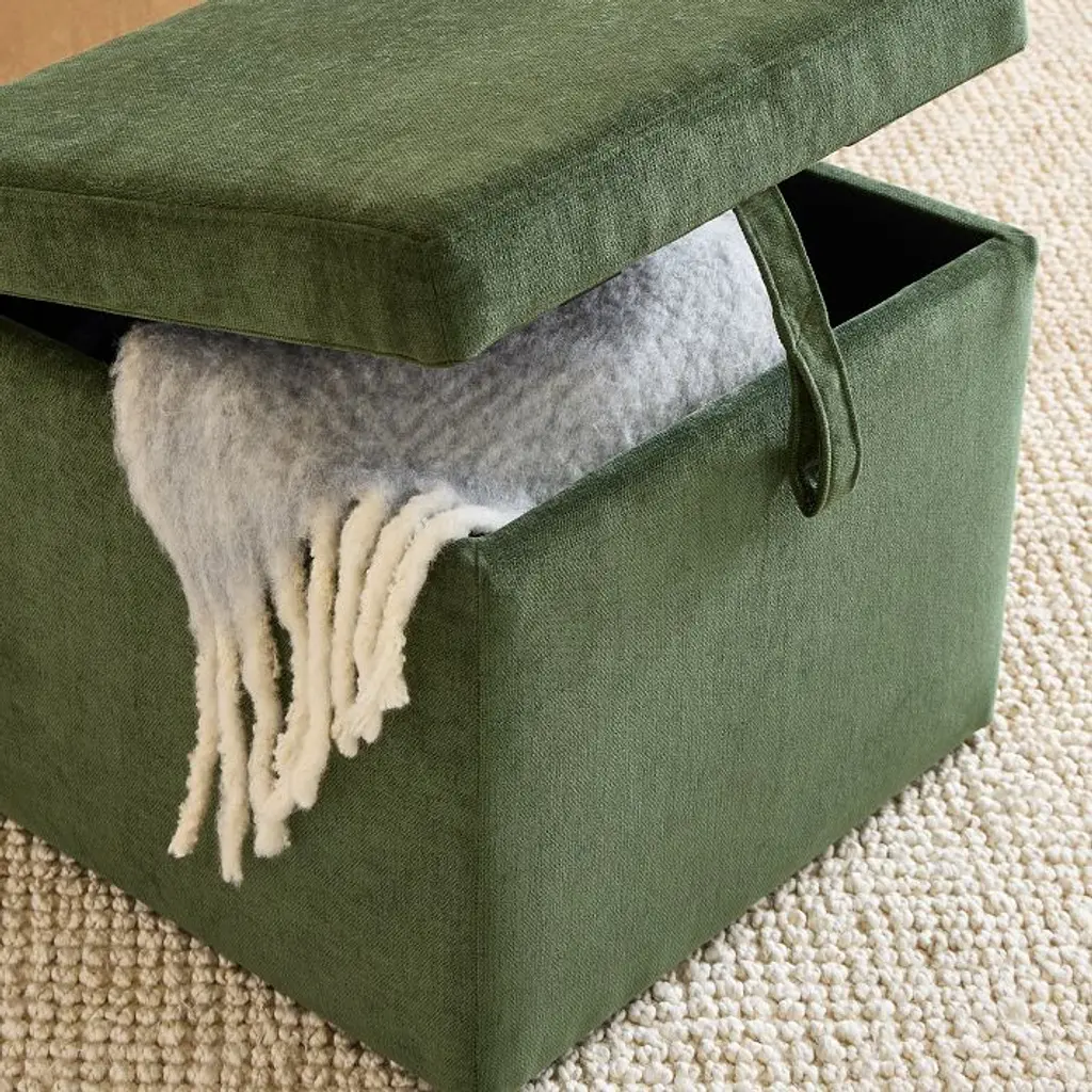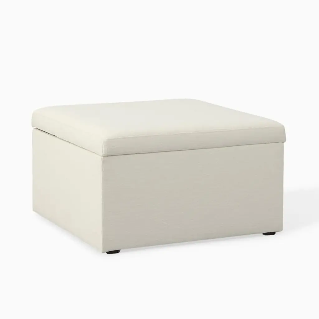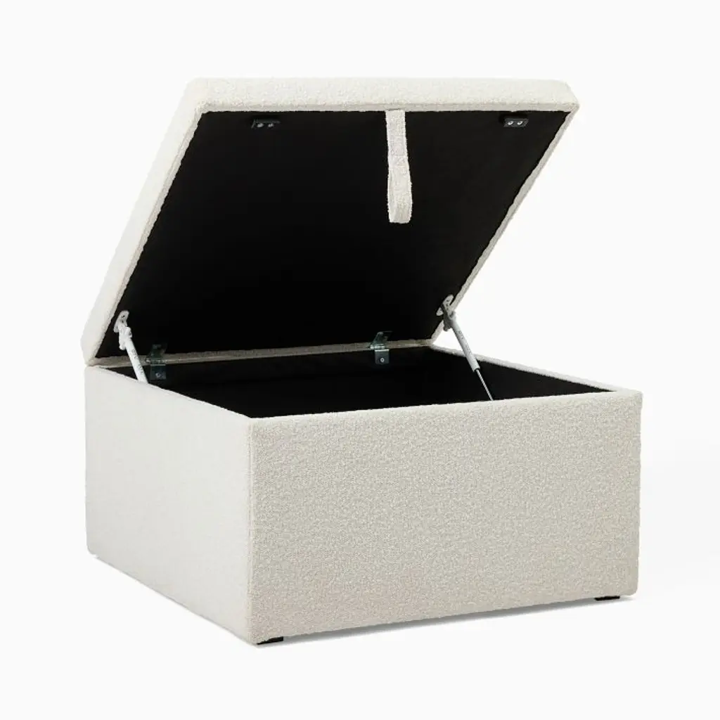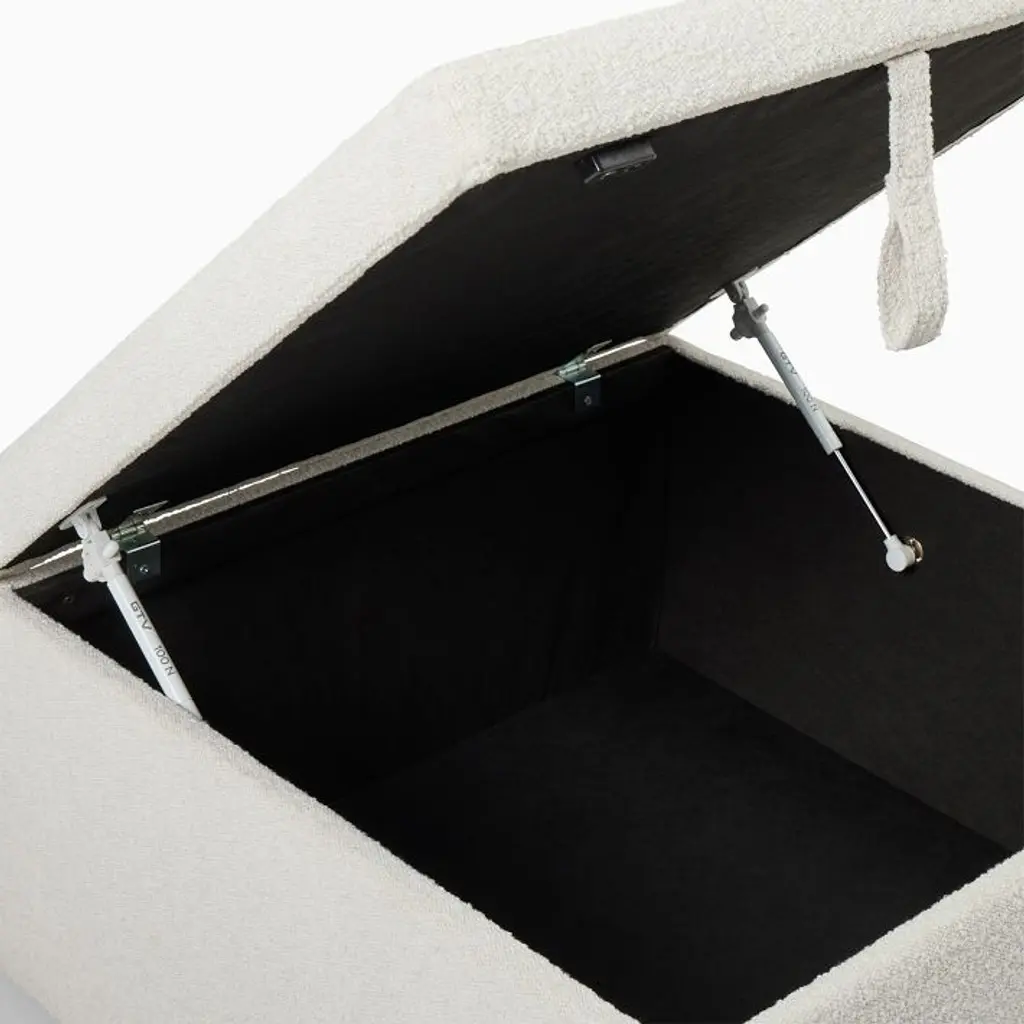 Engineered wood frame. Plastic shadowline support legs. Foam padding. Top lifts up via gas-lift mechanism to reveal storage space. Made in Ukraine.