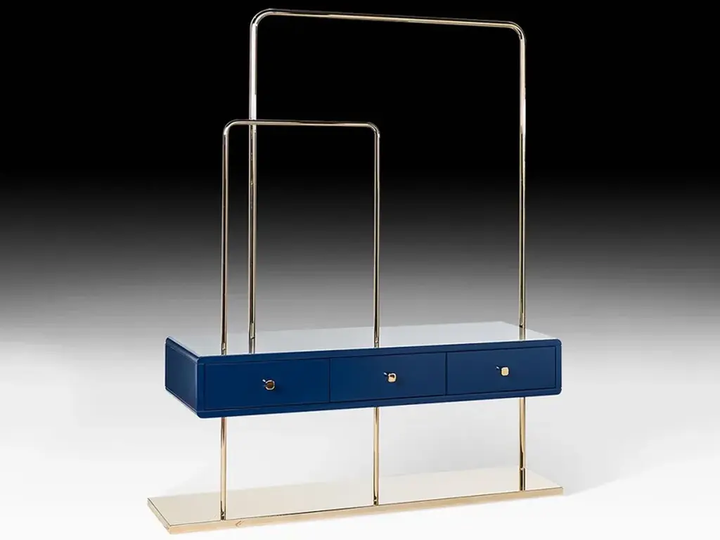 Throughout the Qing Dynasty racks were traditionally used to hang the elaborate coats and intricate dresses of the feudal elite. Emperor’s Clothes Rack again can be used to hang coats and also other clothes at the end of a busy day, or to display a collection of ties and belts for example. The two 24k gold finish hanging rods are of different height, and provide ample space also for clothes hangers, and the bottom drawers serve to store daily wear or accessories.A beautiful furnishing object, coming in various finishes, that not only attracts eyes and hearts of the observer, but also provides convenience in function and an elegant storage solution.Designed by the Chinese architect and interior designer Lea Chen for VG, manufactured by Venetian craftsmen.