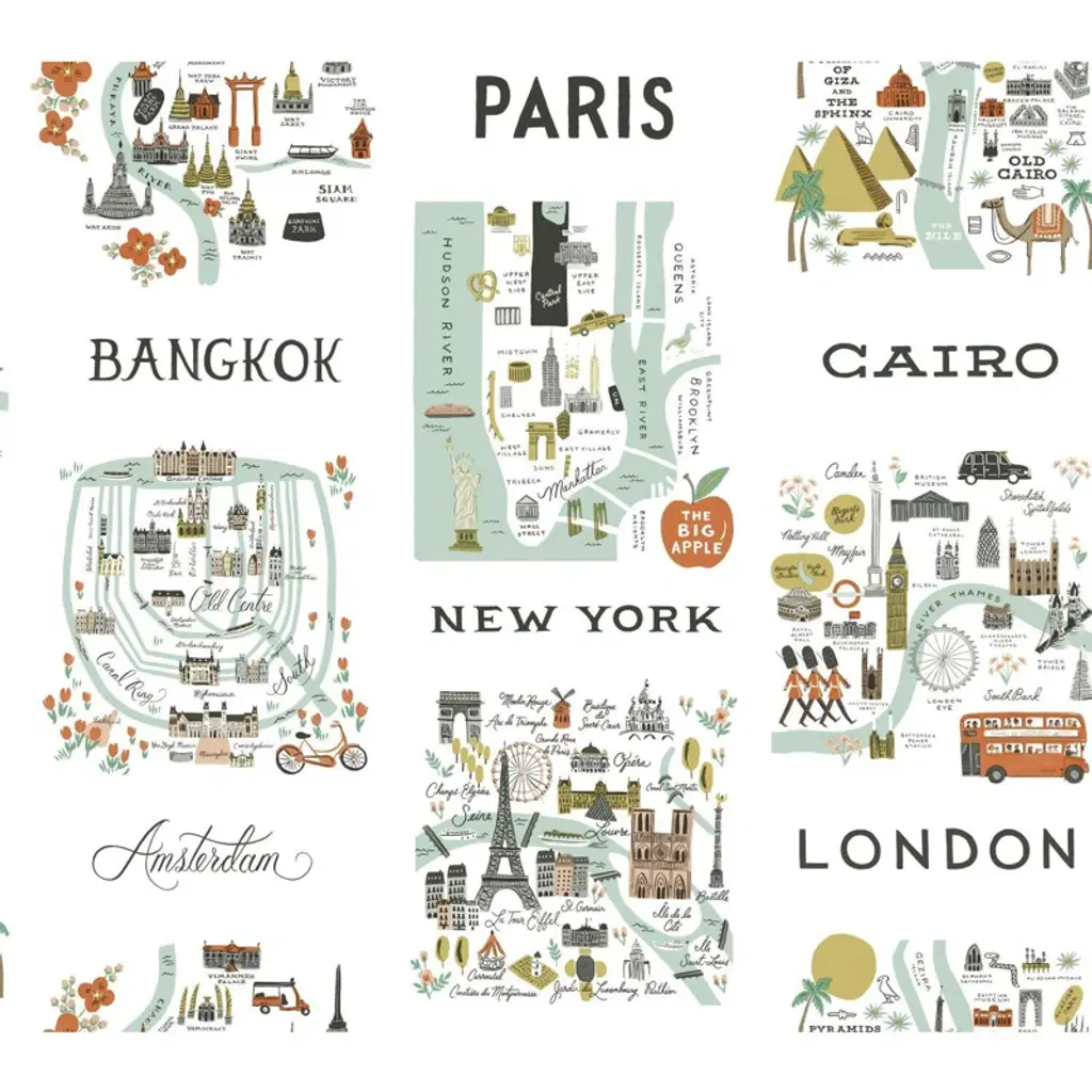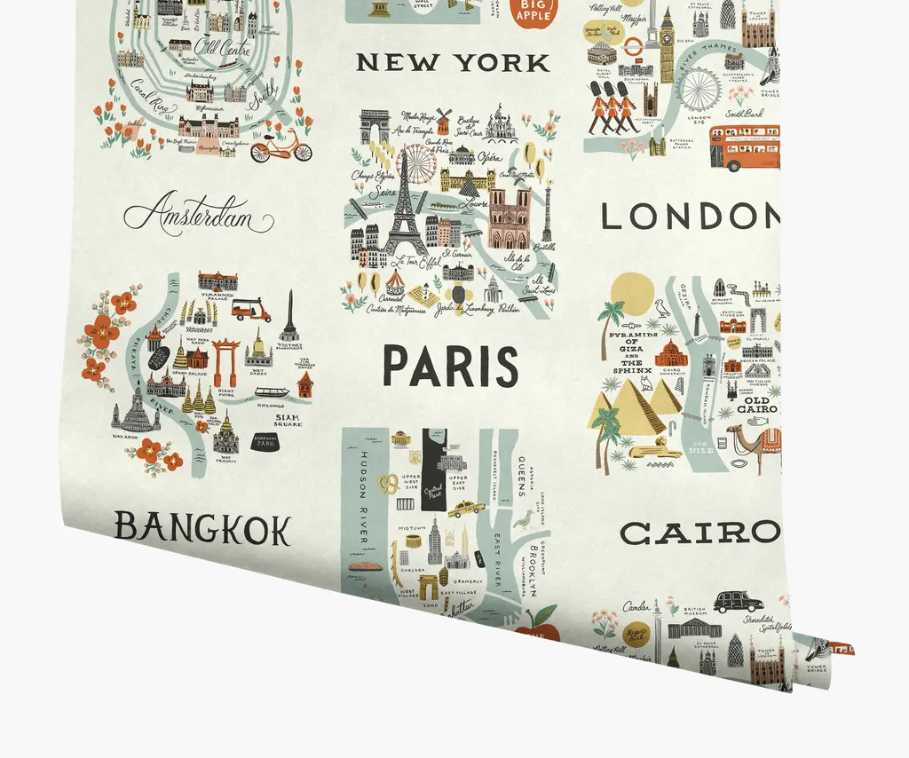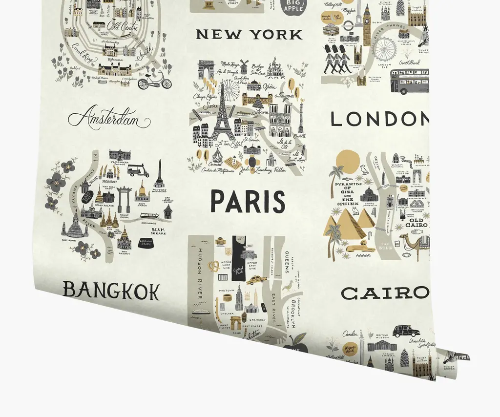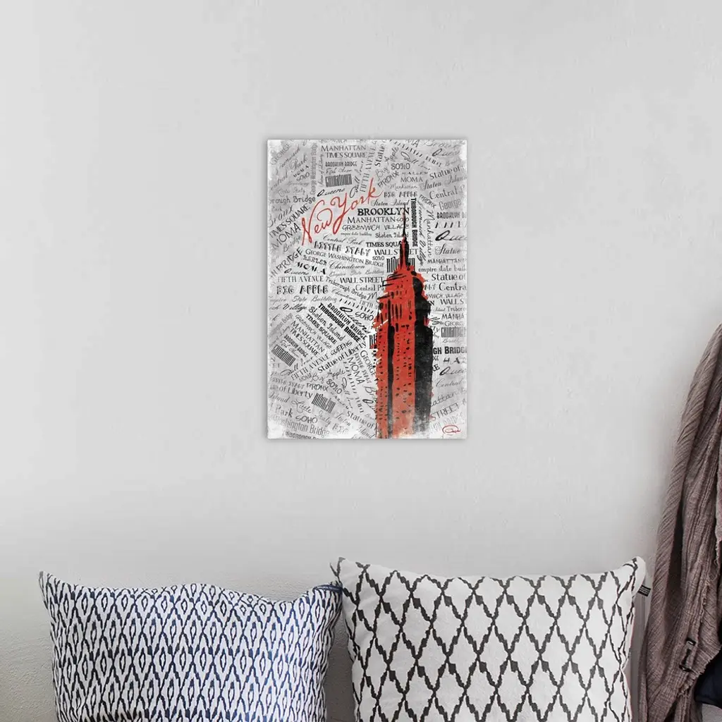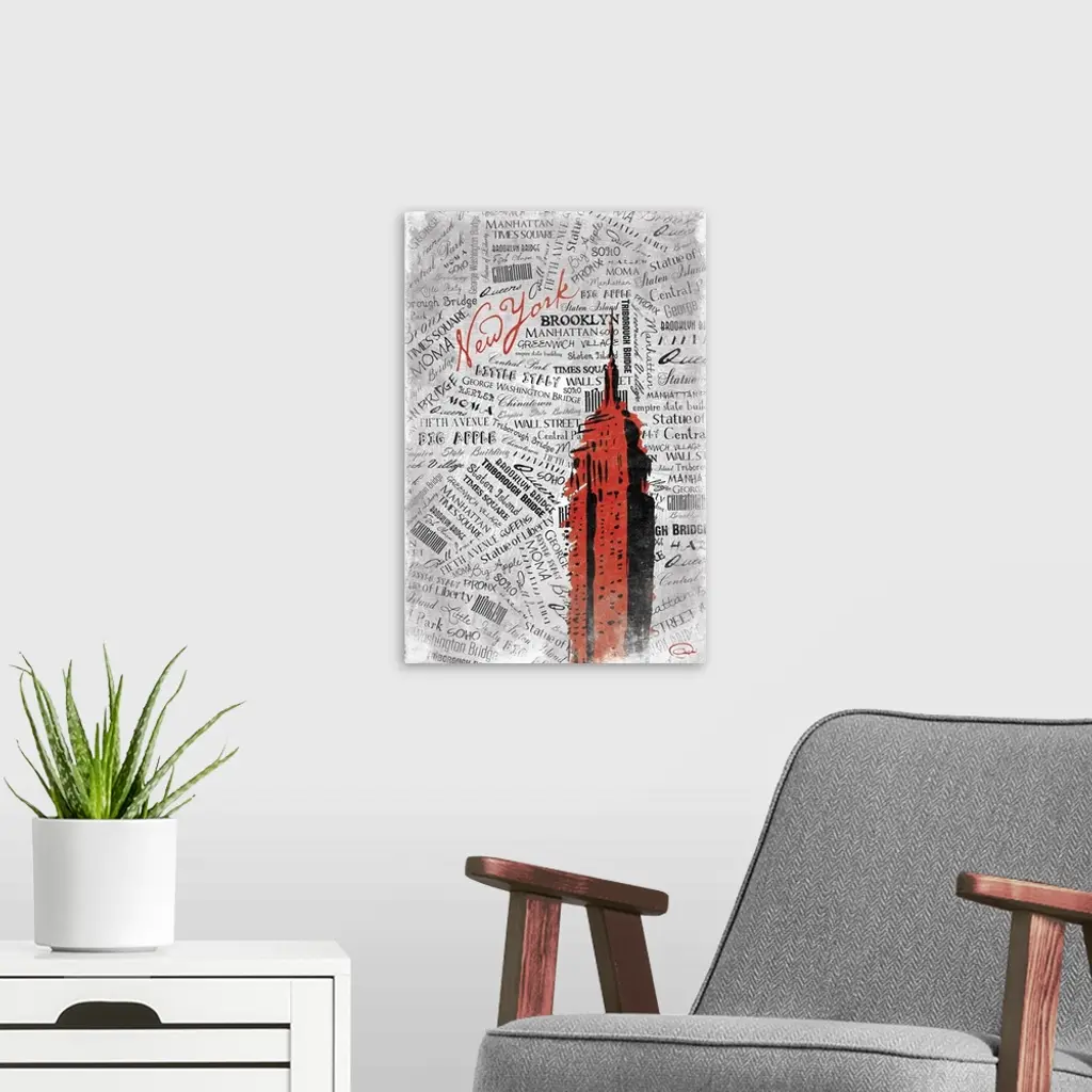The Empire State Building in urban style against layered text background of different locations in New York City.