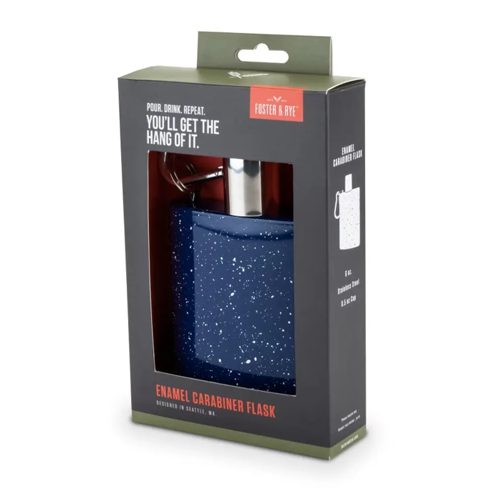 Our campsite-ready carabiner flask, finished in that classic blue and white speckled enamel, hooks effortlessly onto a backpack or belt loop for spirited adventures at the drop of a hat. Holds 6 oz Stainless steel Hold on to your drink Enamel finish Makes a great gift Disclaimer: Flasks aren't meant for storing alcohol long-term. Leaving liquor in a flask for too long might lead to undesirable flavors. To keep things fresh, finish or replace the contents within a few days. Cheers and happy sipping!