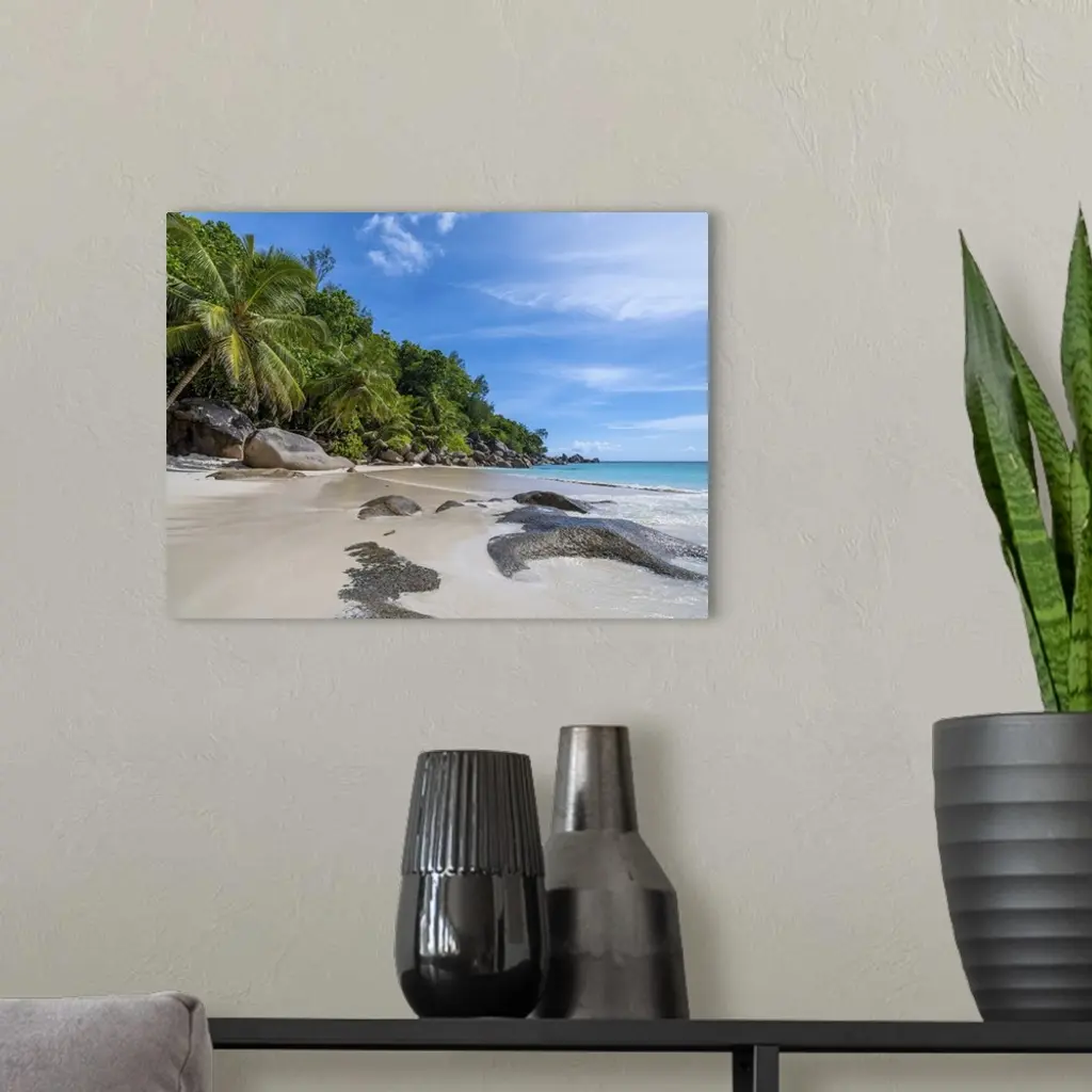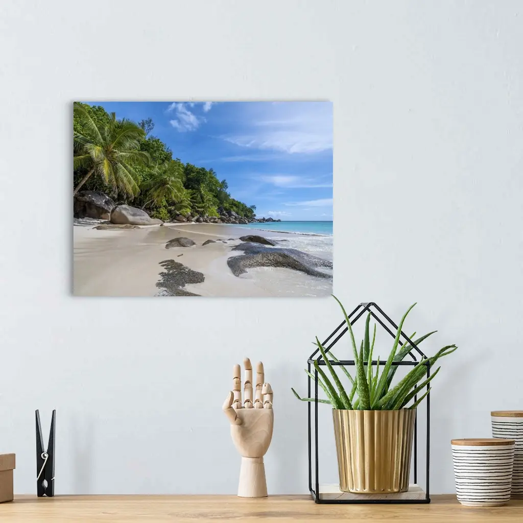 The "Anse Georgette" beach is located on the island of Praslin (Seychelles). It is a heavenly place where the white sand is fine and the color of the sea is turquoise.