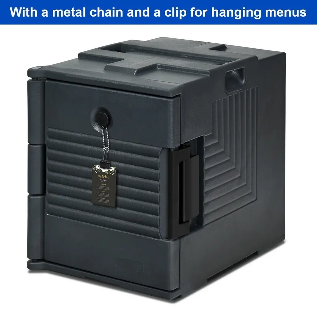 Key FeaturesThis is the insulated food pan carrier which will effectively keep your food warm or cold and improve your living conditions. Â Featuring a strong sealing performance and superior insulation it can keep food hot or cold for over 8 hours. Two hidden handles and stackable design facilitates movement making the food pan carrier take up less space. The 95-quart capacity allows you to place a large number of hot meals or cold drinks and other items. It can be used in restaurants canteens and other places. Â With it the food will stay fresh wherever you go! Don't hesitate to buy one now! Â Double shell filled with commercial-grade polyurethane materials for optimal insulation Inlaid sealing ring and nylon lock for added sealing performance Maintains temperature for both hot or cold food for over 8 hours 95-quart large capacity can hold 6 full-size food pans 12 levels for different sizes of food pans to meet all your needs Two layers of food-grade LLDPE material shell non-toxic and harmless to human health An adjustable vent cap equalizes outside and inside compartment pressure 270-degree revolving door with stainless steel shaft allowing you to take the items out with ease Convenient handles offer flexibility for moving and carrying around Suitable for pre-dining serving widely used in canteens restaurants etc The stackable and interlocking design minimizes space utilization It can be used without electricity reducing energy consumption Note: Food pans are not included Specification: Color: As the picture shows Main material: LLDPE polyurethane nylon Overall dimension: 27" x 19" x 23.5" (L x W x H) Internal dimension: 21" x 13.5" x 20" (L x W x H) Net weight: 35 lbs Capacity: 95 quart Package includes: 1 x Insulated food pan carrier 1 x Instruction