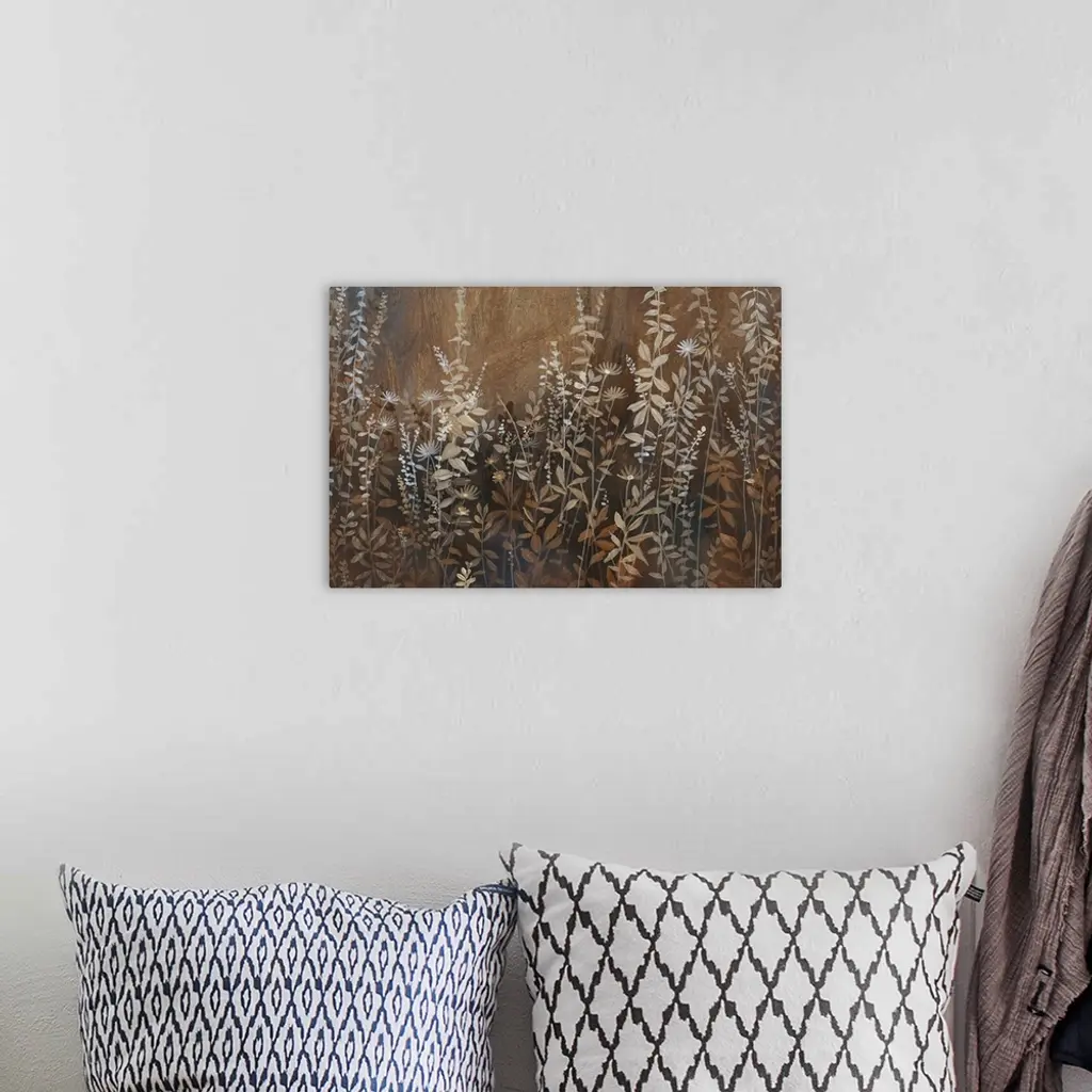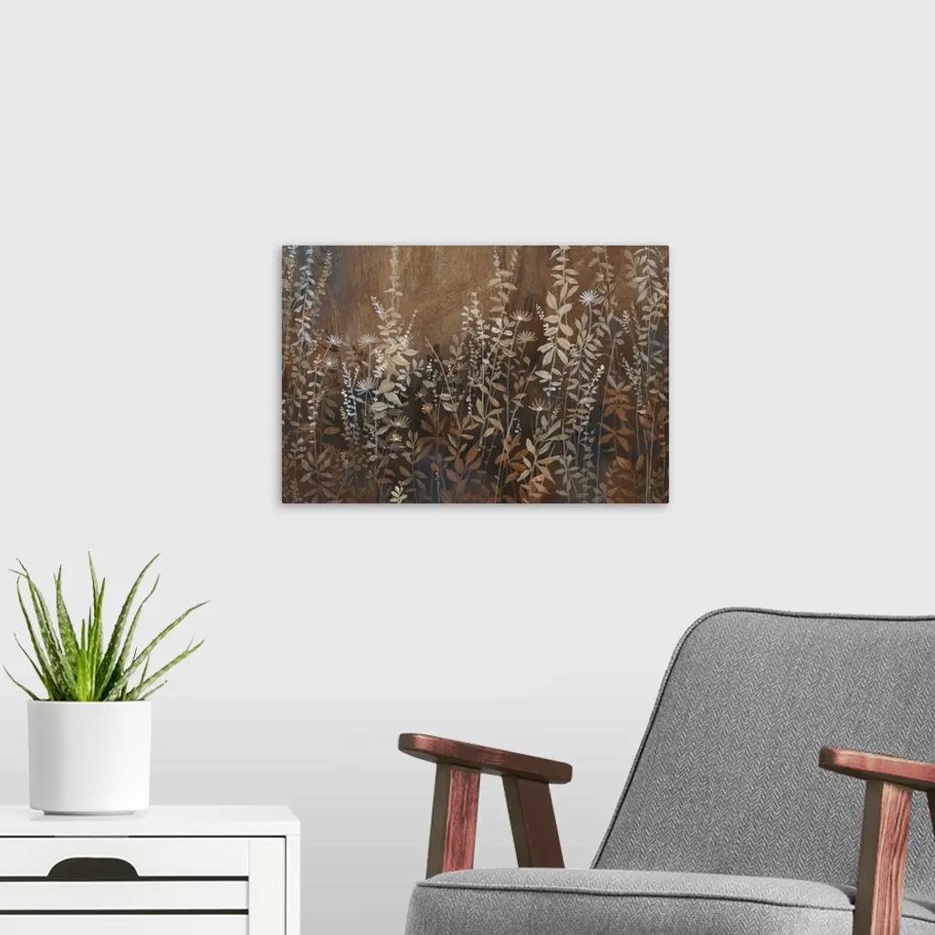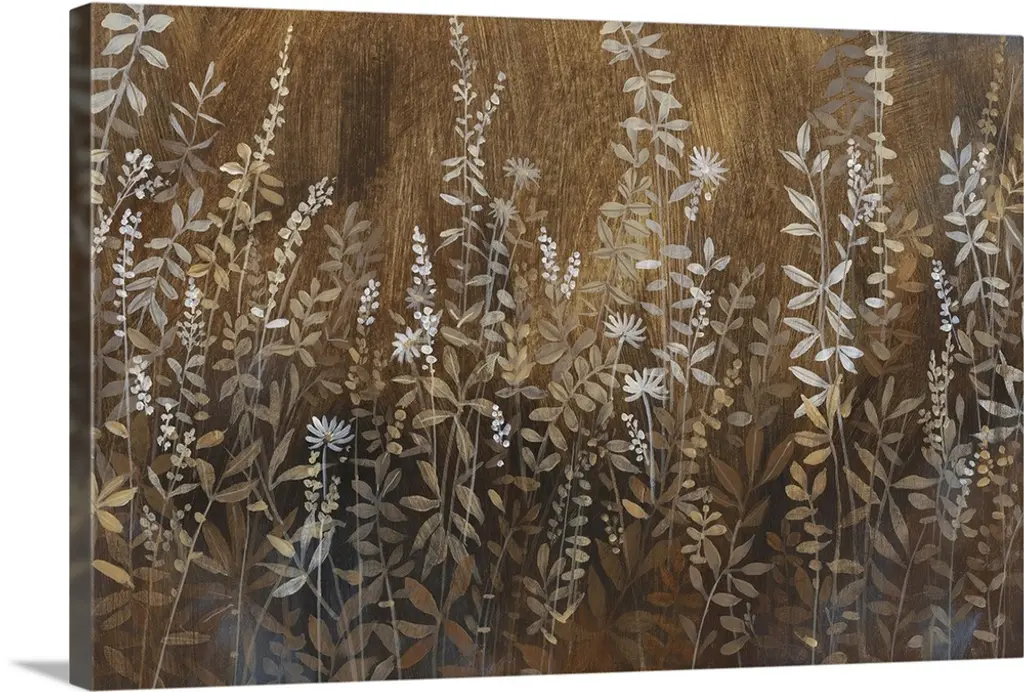 A field full of wild flowers and plants in muted brown earth tones.