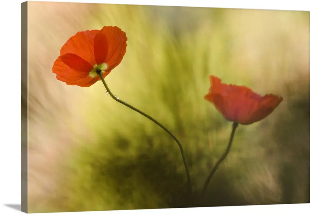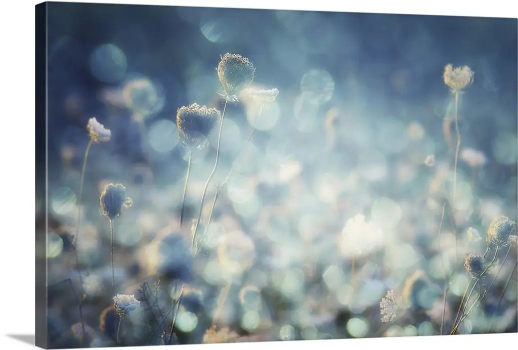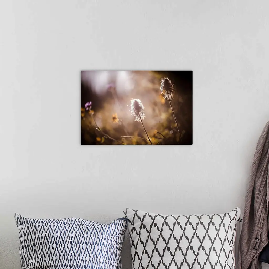 An image of two seedheads of the Pasque Flower, which grow profusely in mountain meadows in British Columbia, Canada. The image was shot against the sunlight with a macro lens at F/2.8, highlighting the edges and hairs of the mopheads while keeping the surrounding scene slightly blurred. Ursula Abresch Wildflowers Collection