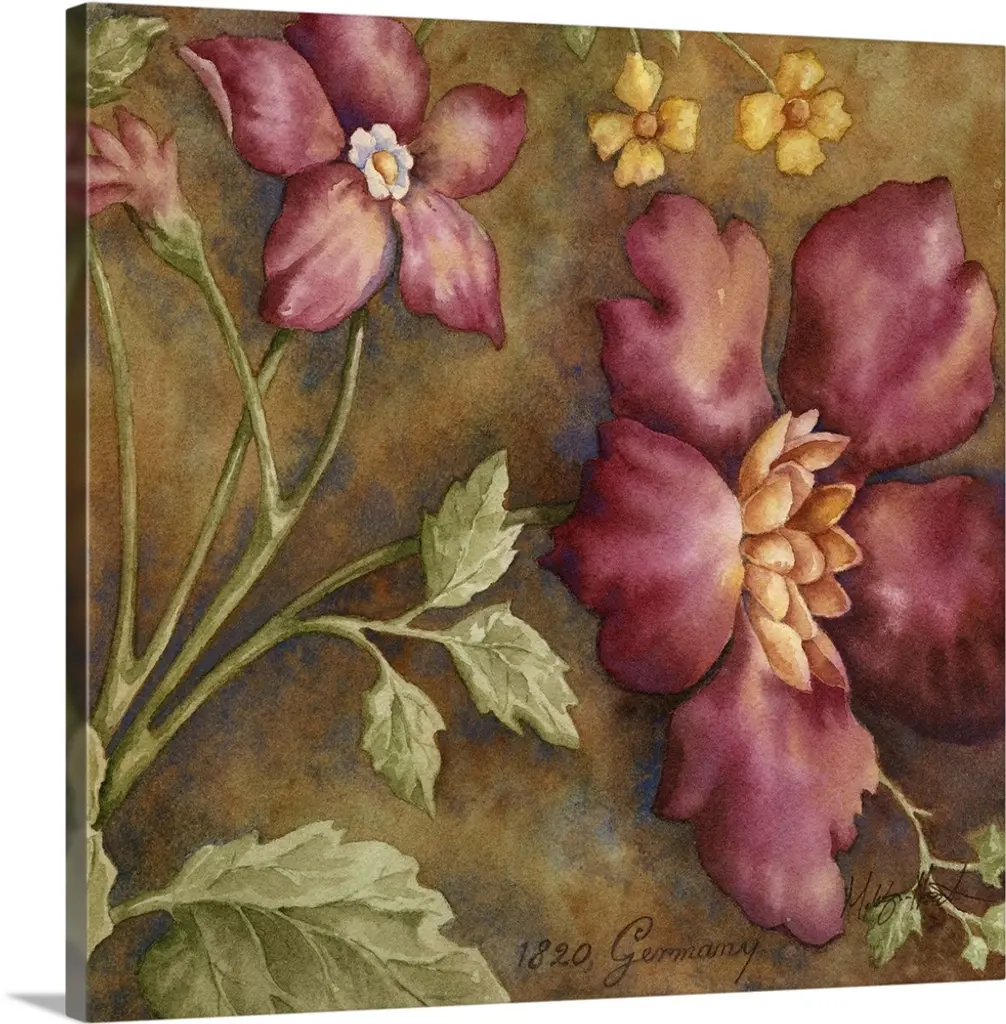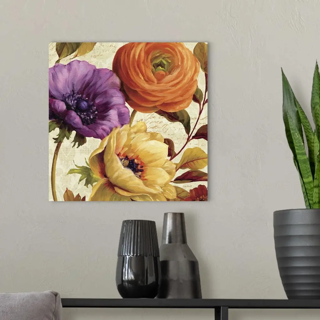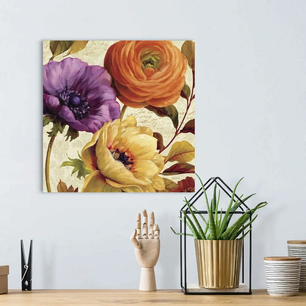 Square home art docor on a large canvas of several vibrant flowers surrounded by leaves, on a light, decorative background with random script handwriting.