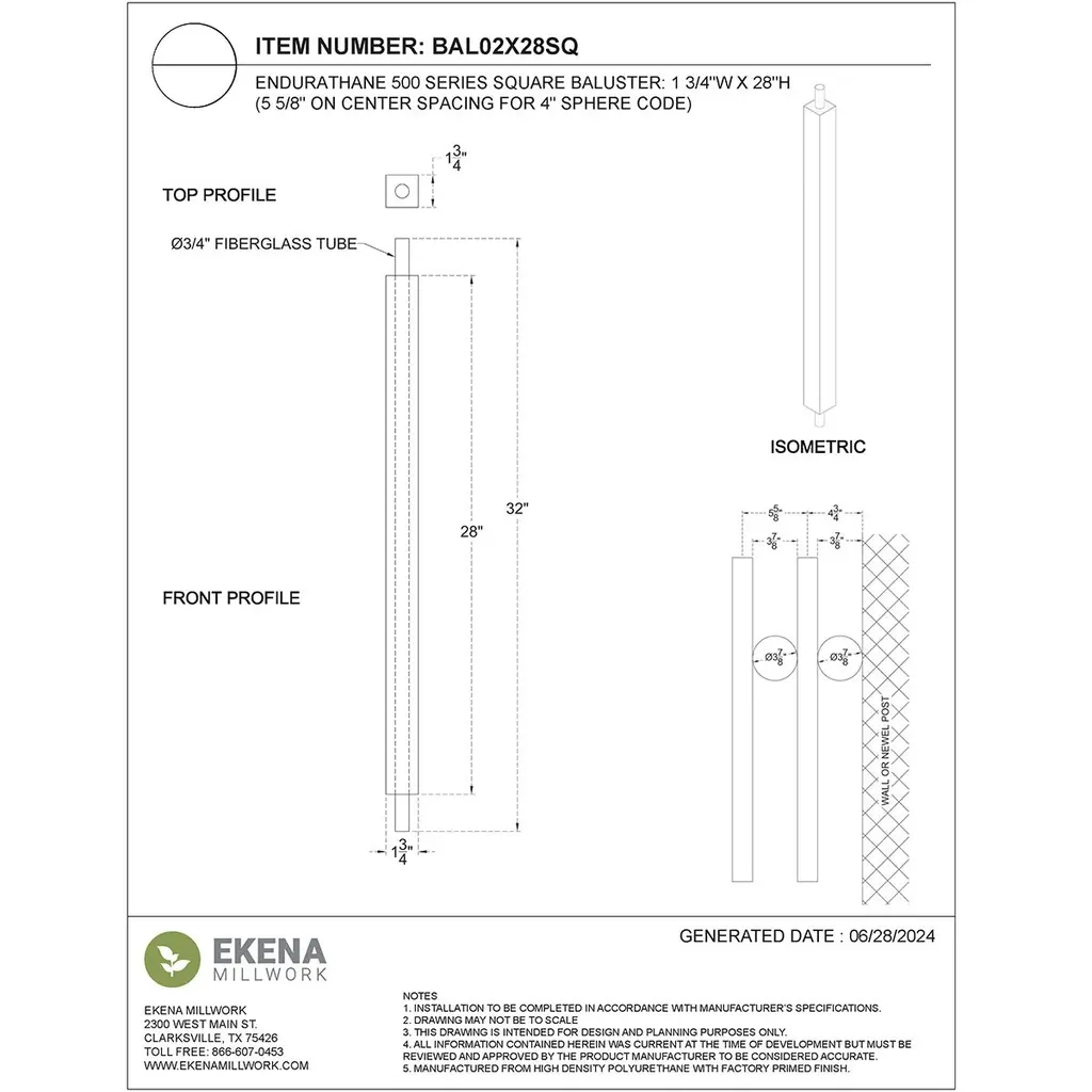 Endurathane 500 Series Square Baluster, Factory Primed Polyurethane - 1 3/4"w X 28"h