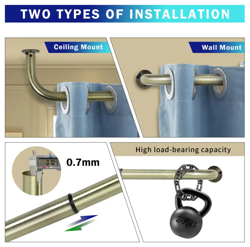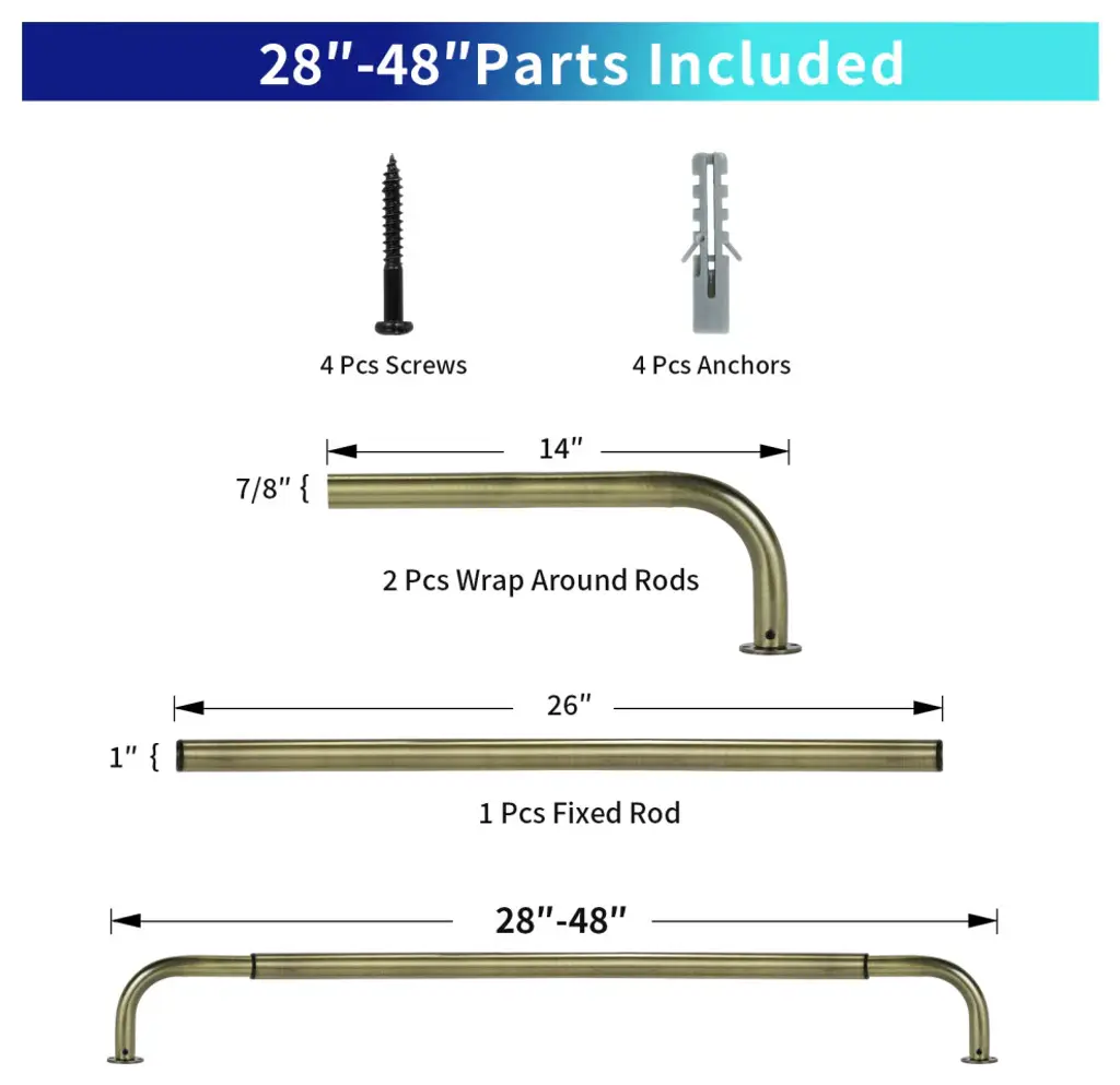 ROOM DARKENING & SAVE ENERGY: Wraparound design, NO GAP between wall and window drape. Block sunlight, reduce noise, no draft, no heat loss. Saving EnergyHIGH QUALITY: Rustproof, made with all Premium HIGH QUALITY METAL. Heavy Duty Sturdy Window Rod Set. Can hold up to 30 lbs.SIZE: 1" diameter, Extendable from 28"-48" / 32"-52" / 48"-84" / 52"-96" / 84"-120" / 96"-144". Adjustable Projection form the wall is 4" - 5". EASY SET-UP: All mounting hardware included, 1 telescoping curtain rod, screws, drywall anchors, and installation instructions. One additional center support bracket comes with 48"-84" / 52"-96" / 84"-120" / 96"-144" rod set. It can be wall or ceiling mounted indoor or outdoor. Install in minutes.MODERN DESIGN: The minimalist design gives this rod set an unique industrial look. Comes with multiple color options for designer: Matte Black, Glossy White, Oil-rubbed Bronze, Brushed Stainless Steel, Antique Brass, Antique Silver/Pewter, Antique Gold, and Renaissance Gold.