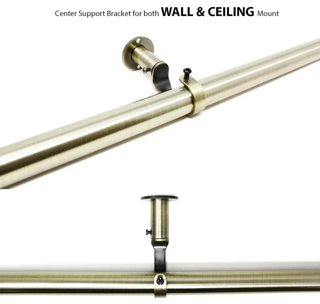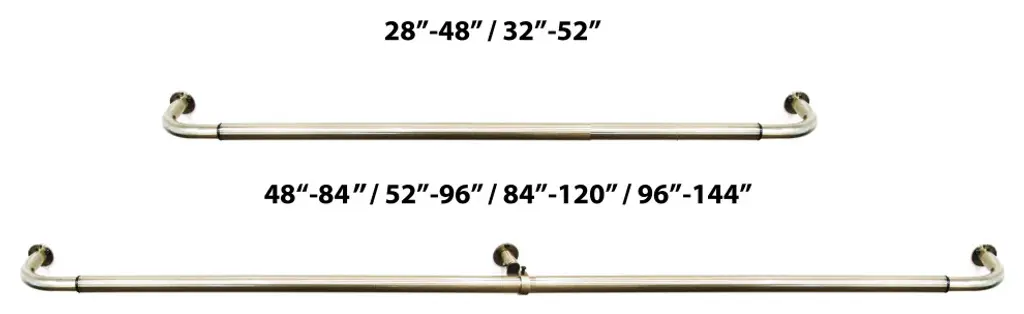 ROOM DARKENING & SAVE ENERGY: Wraparound design, NO GAP between wall and window drape. Block sunlight, reduce noise, no draft, no heat loss. Saving EnergyHIGH QUALITY: Rustproof, made with all Premium HIGH QUALITY METAL. Heavy Duty Sturdy Window Rod Set. Can hold up to 30 lbs.SIZE: 1" diameter, Extendable from 28"-48" / 32"-52" / 48"-84" / 52"-96" / 84"-120" / 96"-144". Adjustable Projection form the wall is 4" - 5". EASY SET-UP: All mounting hardware included, 1 telescoping curtain rod, screws, drywall anchors, and installation instructions. One additional center support bracket comes with 48"-84" / 52"-96" / 84"-120" / 96"-144" rod set. It can be wall or ceiling mounted indoor or outdoor. Install in minutes.MODERN DESIGN: The minimalist design gives this rod set an unique industrial look. Comes with multiple color options for designer: Matte Black, Glossy White, Oil-rubbed Bronze, Brushed Stainless Steel, Antique Brass, Antique Silver/Pewter, Antique Gold, and Renaissance Gold.