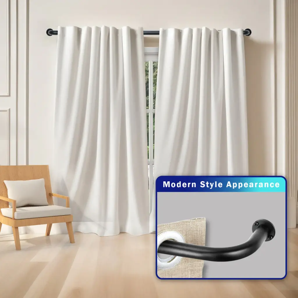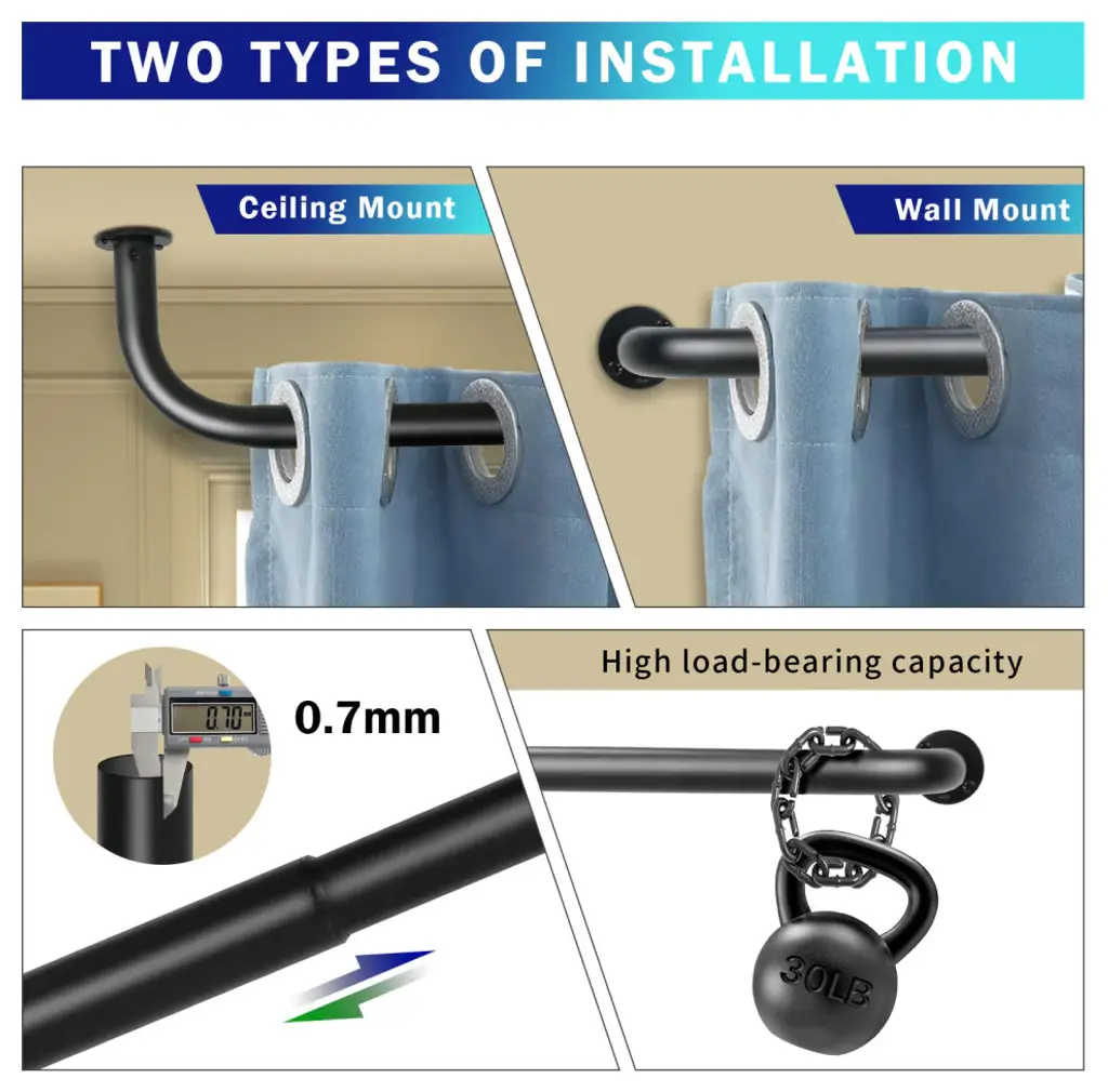 ROOM DARKENING & SAVE ENERGY: Wraparound design, NO GAP between wall and window drape. Block sunlight, reduce noise, no draft, no heat loss. Saving EnergyHIGH QUALITY: Rustproof, made with all Premium HIGH QUALITY METAL. Heavy Duty Sturdy Window Rod Set. Can hold up to 30 lbs.SIZE: 1" diameter, Extendable from 28"-48" / 32"-52" / 48"-84" / 52"-96" / 84"-120" / 96"-144". Adjustable Projection form the wall is 4" - 5". EASY SET-UP: All mounting hardware included, 1 telescoping curtain rod, screws, drywall anchors, and installation instructions. One additional center support bracket comes with 48"-84" / 52"-96" / 84"-120" / 96"-144" rod set. It can be wall or ceiling mounted indoor or outdoor. Install in minutes.MODERN DESIGN: The minimalist design gives this rod set an unique industrial look. Comes with multiple color options for designer: Matte Black, Glossy White, Oil-rubbed Bronze, Brushed Stainless Steel, Antique Brass, Antique Silver/Pewter, Antique Gold, and Renaissance Gold.
