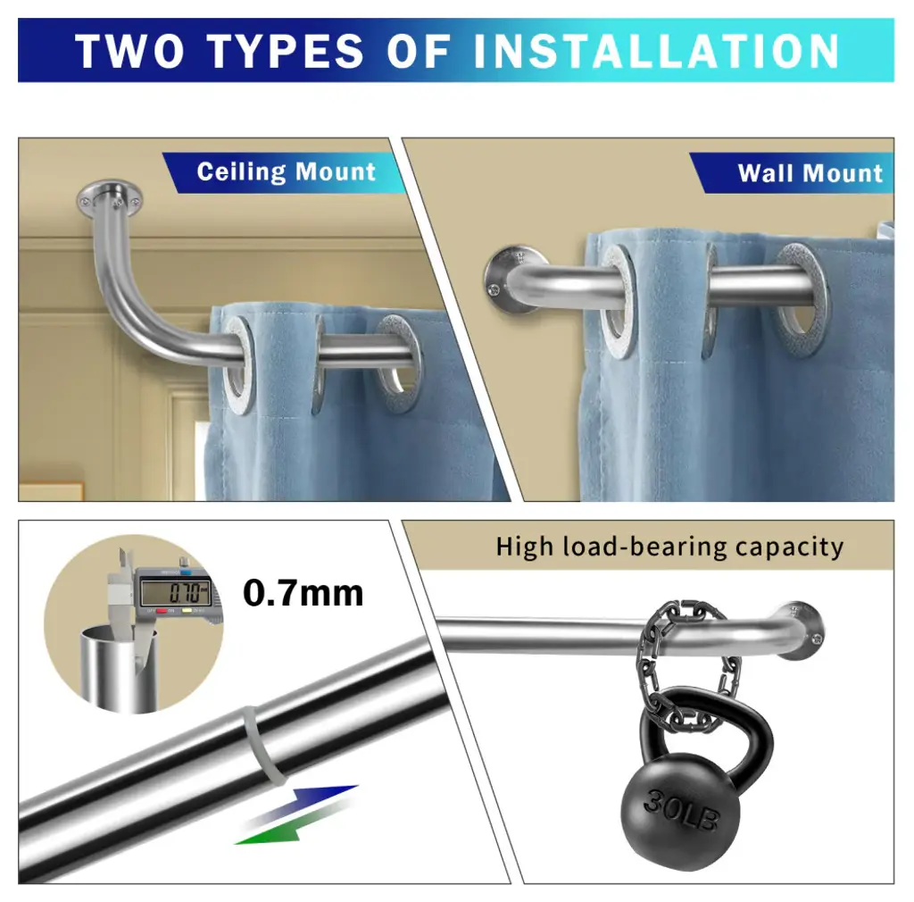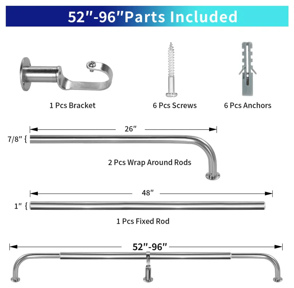 ROOM DARKENING & SAVE ENERGY: Wraparound design, NO GAP between wall and window drape. Block sunlight, reduce noise, no draft, no heat loss. Saving EnergyHIGH QUALITY: Rustproof, made with all Premium HIGH QUALITY METAL. Heavy Duty Sturdy Window Rod Set. Can hold up to 30 lbs.SIZE: 1" diameter, Extendable from 28"-48" / 32"-52" / 48"-84" / 52"-96" / 84"-120" / 96"-144". Adjustable Projection form the wall is 4" - 5". EASY SET-UP: All mounting hardware included, 1 telescoping curtain rod, screws, drywall anchors, and installation instructions. One additional center support bracket comes with 48"-84" / 52"-96" / 84"-120" / 96"-144" rod set. It can be wall or ceiling mounted indoor or outdoor. Install in minutes.MODERN DESIGN: The minimalist design gives this rod set an unique industrial look. Comes with multiple color options for designer: Matte Black, Glossy White, Oil-rubbed Bronze, Brushed Stainless Steel, Antique Brass, Antique Silver/Pewter, Antique Gold, and Renaissance Gold.