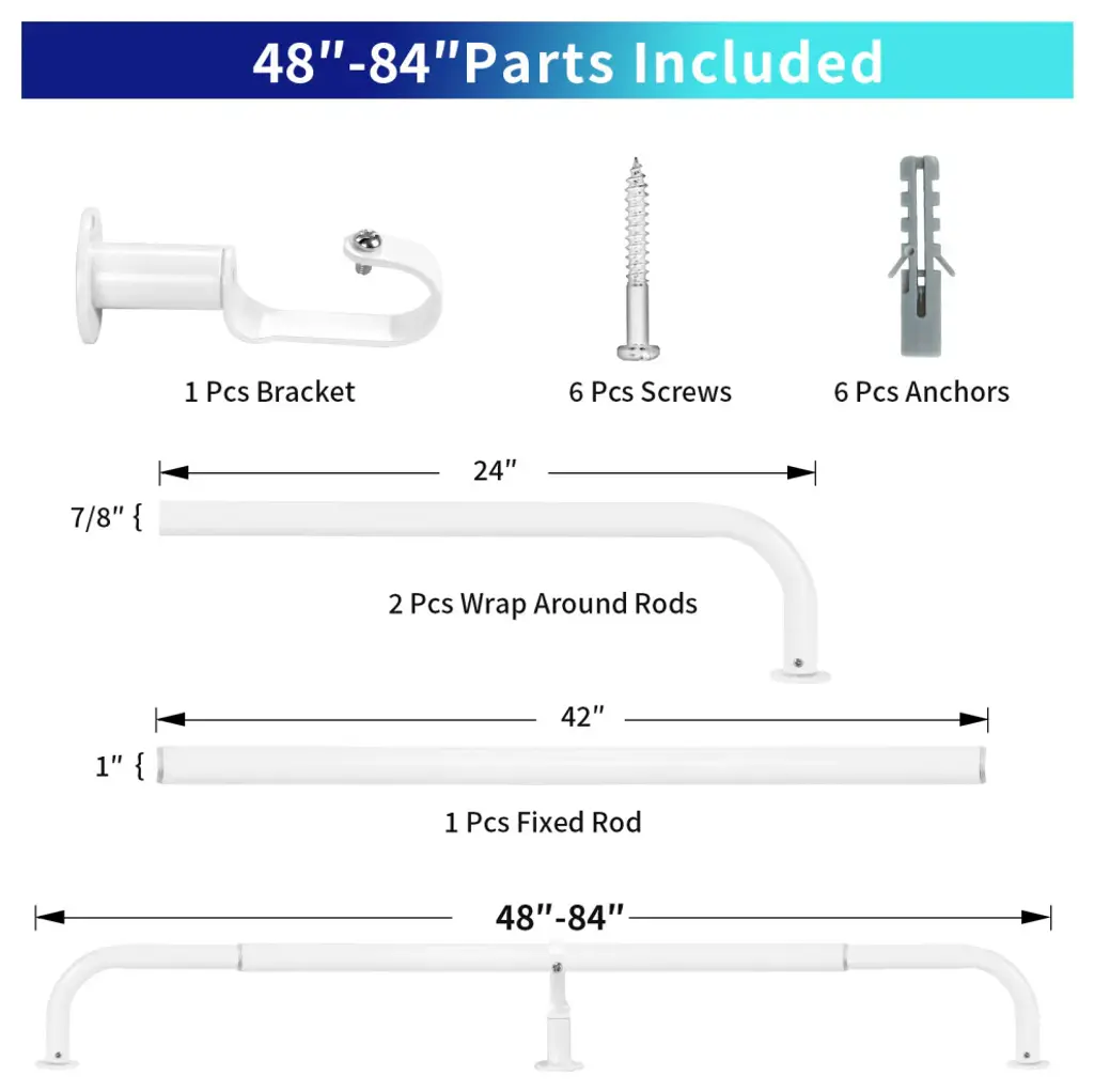 ROOM DARKENING & SAVE ENERGY: Wraparound design, NO GAP between wall and window drape. Block sunlight, reduce noise, no draft, no heat loss. Saving EnergyHIGH QUALITY: Rustproof, made with all Premium HIGH QUALITY METAL. Heavy Duty Sturdy Window Rod Set. Can hold up to 30 lbs.SIZE: 1" diameter, Extendable from 28"-48" / 32"-52" / 48"-84" / 52"-96" / 84"-120" / 96"-144". Adjustable Projection form the wall is 4" - 5". EASY SET-UP: All mounting hardware included, 1 telescoping curtain rod, screws, drywall anchors, and installation instructions. One additional center support bracket comes with 48"-84" / 52"-96" / 84"-120" / 96"-144" rod set. It can be wall or ceiling mounted indoor or outdoor. Install in minutes.MODERN DESIGN: The minimalist design gives this rod set an unique industrial look. Comes with multiple color options for designer: Matte Black, Glossy White, Oil-rubbed Bronze, Brushed Stainless Steel, Antique Brass, Antique Silver/Pewter, Antique Gold, and Renaissance Gold.