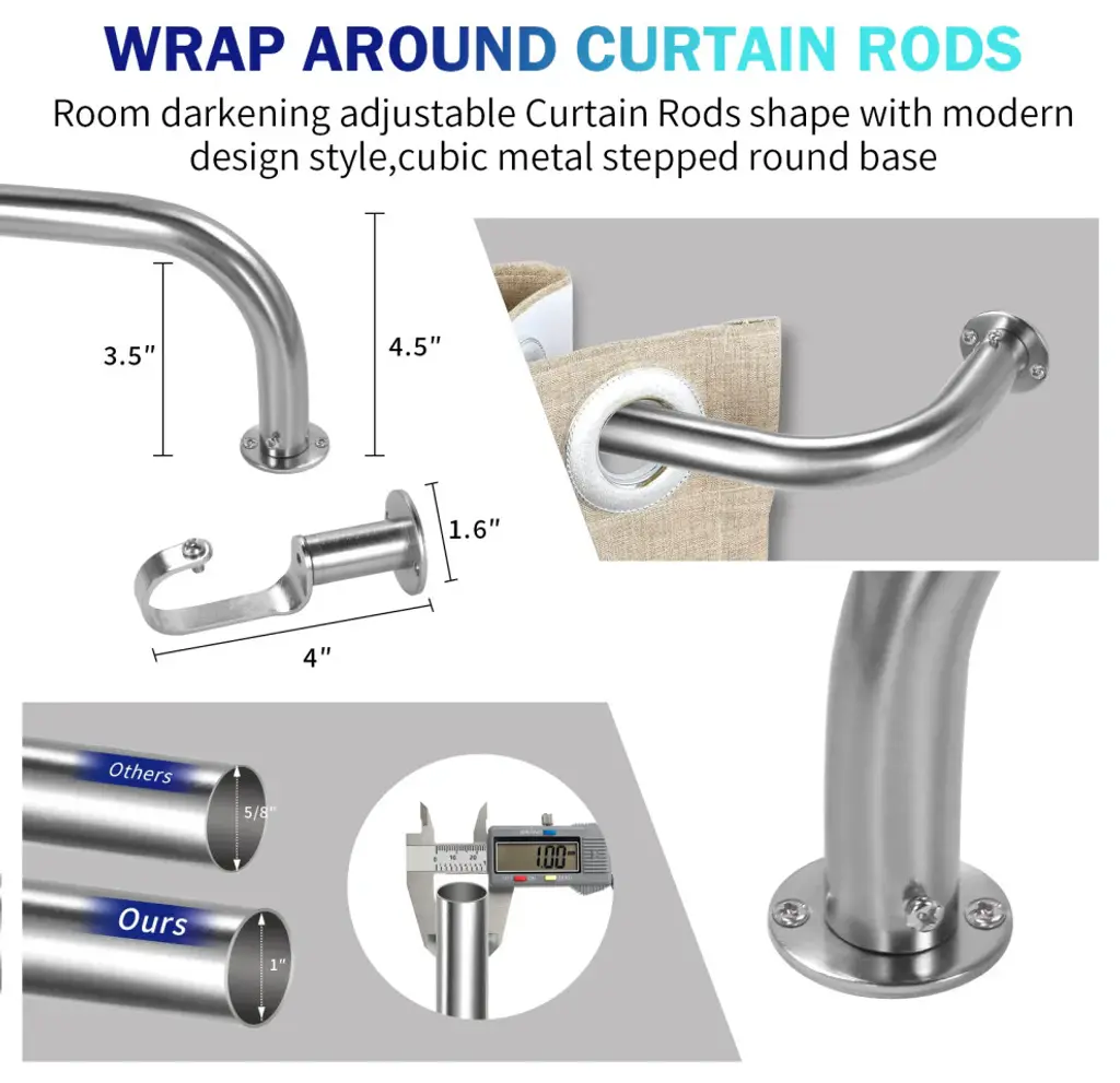 Energy Saving Wrap Around Black Out Return Adjustable Window Curtain Metal Rod, Brushed Steel, 96-144"