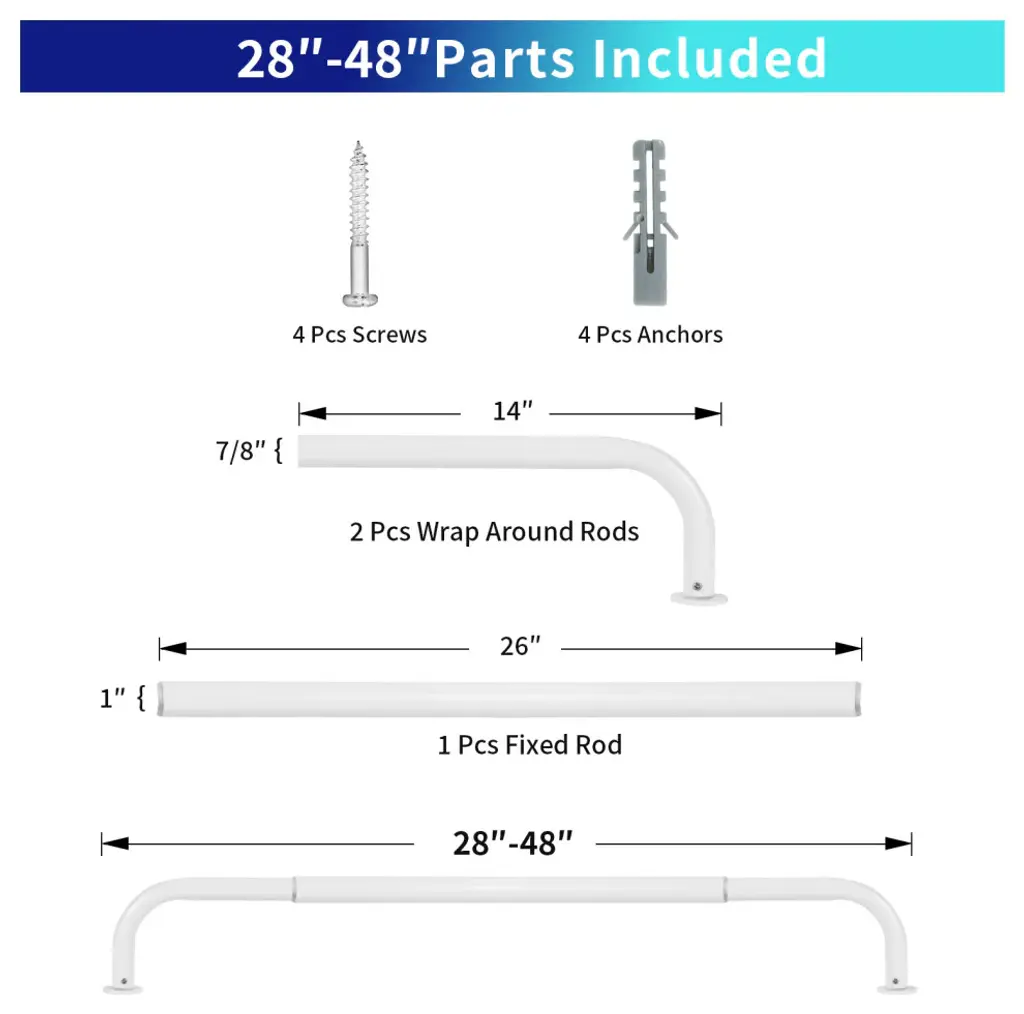 ROOM DARKENING & SAVE ENERGY: Wraparound design, NO GAP between wall and window drape. Block sunlight, reduce noise, no draft, no heat loss. Saving EnergyHIGH QUALITY: Rustproof, made with all Premium HIGH QUALITY METAL. Heavy Duty Sturdy Window Rod Set. Can hold up to 30 lbs.SIZE: 1" diameter, Extendable from 28"-48" / 32"-52" / 48"-84" / 52"-96" / 84"-120" / 96"-144". Adjustable Projection form the wall is 4" - 5". EASY SET-UP: All mounting hardware included, 1 telescoping curtain rod, screws, drywall anchors, and installation instructions. One additional center support bracket comes with 48"-84" / 52"-96" / 84"-120" / 96"-144" rod set. It can be wall or ceiling mounted indoor or outdoor. Install in minutes.MODERN DESIGN: The minimalist design gives this rod set an unique industrial look. Comes with multiple color options for designer: Matte Black, Glossy White, Oil-rubbed Bronze, Brushed Stainless Steel, Antique Brass, Antique Silver/Pewter, Antique Gold, and Renaissance Gold.