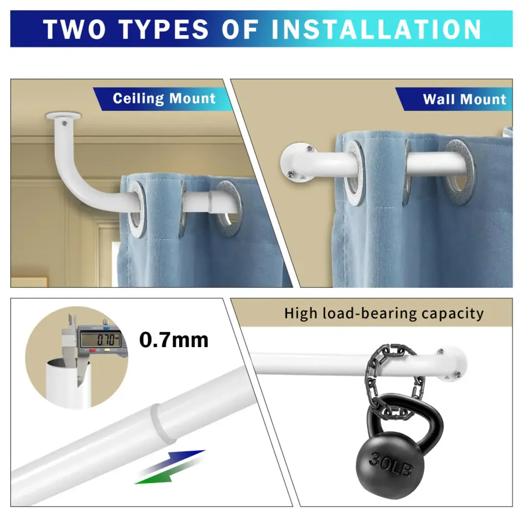 ROOM DARKENING & SAVE ENERGY: Wraparound design, NO GAP between wall and window drape. Block sunlight, reduce noise, no draft, no heat loss. Saving EnergyHIGH QUALITY: Rustproof, made with all Premium HIGH QUALITY METAL. Heavy Duty Sturdy Window Rod Set. Can hold up to 30 lbs.SIZE: 1" diameter, Extendable from 28"-48" / 32"-52" / 48"-84" / 52"-96" / 84"-120" / 96"-144". Adjustable Projection form the wall is 4" - 5". EASY SET-UP: All mounting hardware included, 1 telescoping curtain rod, screws, drywall anchors, and installation instructions. One additional center support bracket comes with 48"-84" / 52"-96" / 84"-120" / 96"-144" rod set. It can be wall or ceiling mounted indoor or outdoor. Install in minutes.MODERN DESIGN: The minimalist design gives this rod set an unique industrial look. Comes with multiple color options for designer: Matte Black, Glossy White, Oil-rubbed Bronze, Brushed Stainless Steel, Antique Brass, Antique Silver/Pewter, Antique Gold, and Renaissance Gold.