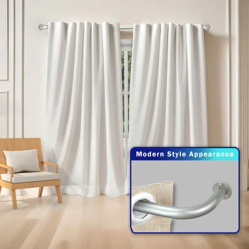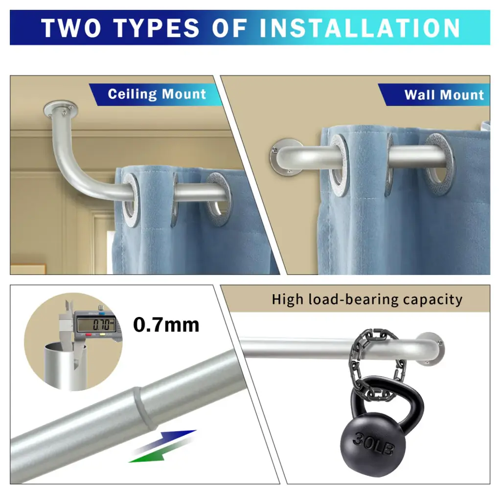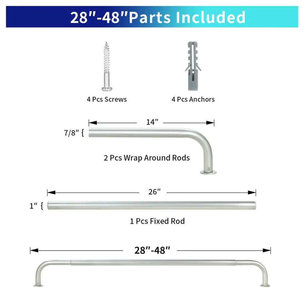 ROOM DARKENING & SAVE ENERGY: Wraparound design, NO GAP between wall and window drape. Block sunlight, reduce noise, no draft, no heat loss. Saving EnergyHIGH QUALITY: Rustproof, made with all Premium HIGH QUALITY METAL. Heavy Duty Sturdy Window Rod Set. Can hold up to 30 lbs.SIZE: 1" diameter, Extendable from 28"-48" / 32"-52" / 48"-84" / 52"-96" / 84"-120" / 96"-144". Adjustable Projection form the wall is 4" - 5". EASY SET-UP: All mounting hardware included, 1 telescoping curtain rod, screws, drywall anchors, and installation instructions. One additional center support bracket comes with 48"-84" / 52"-96" / 84"-120" / 96"-144" rod set. It can be wall or ceiling mounted indoor or outdoor. Install in minutes.MODERN DESIGN: The minimalist design gives this rod set an unique industrial look. Comes with multiple color options for designer: Matte Black, Glossy White, Oil-rubbed Bronze, Brushed Stainless Steel, Antique Brass, Antique Silver/Pewter, Antique Gold, and Renaissance Gold.