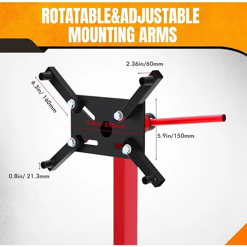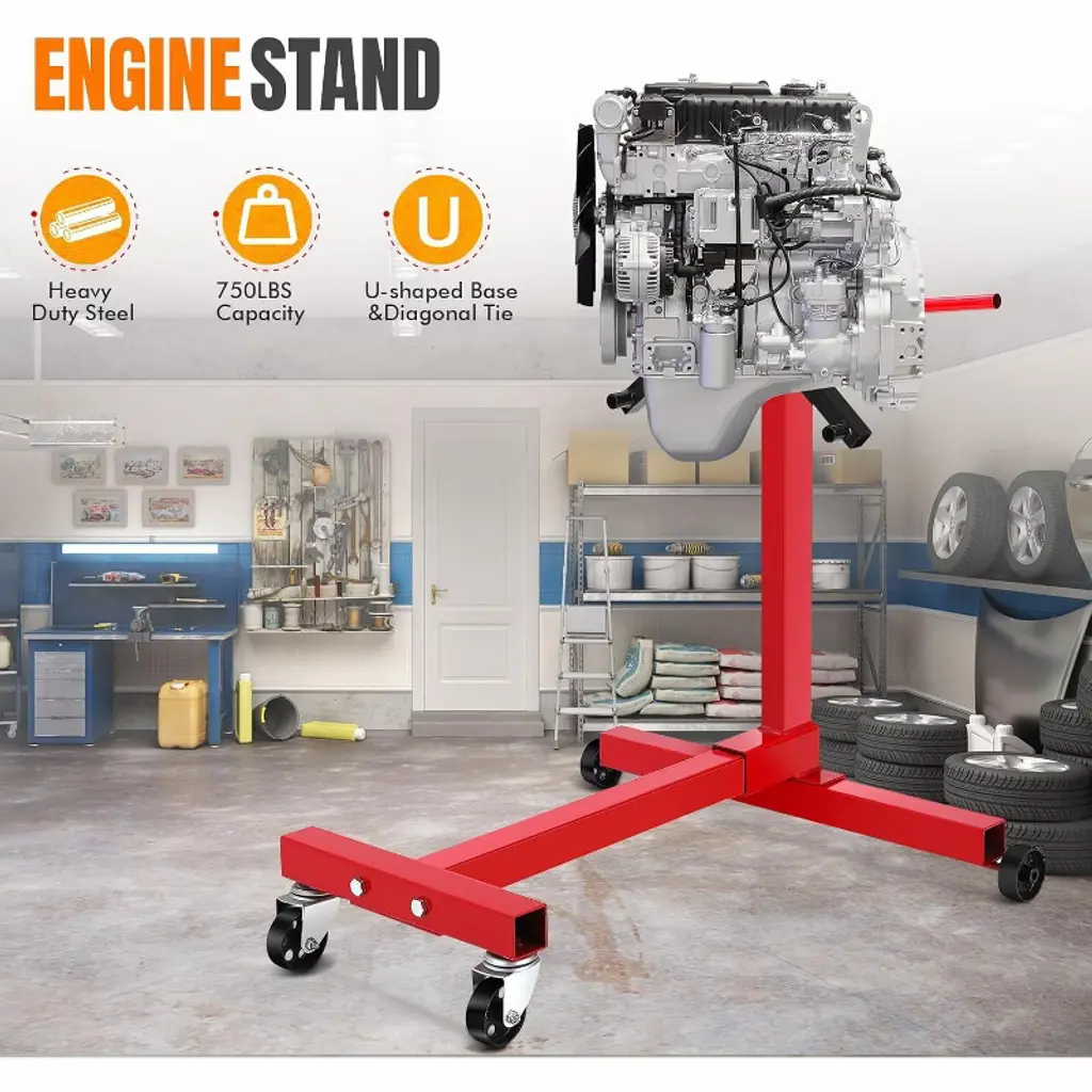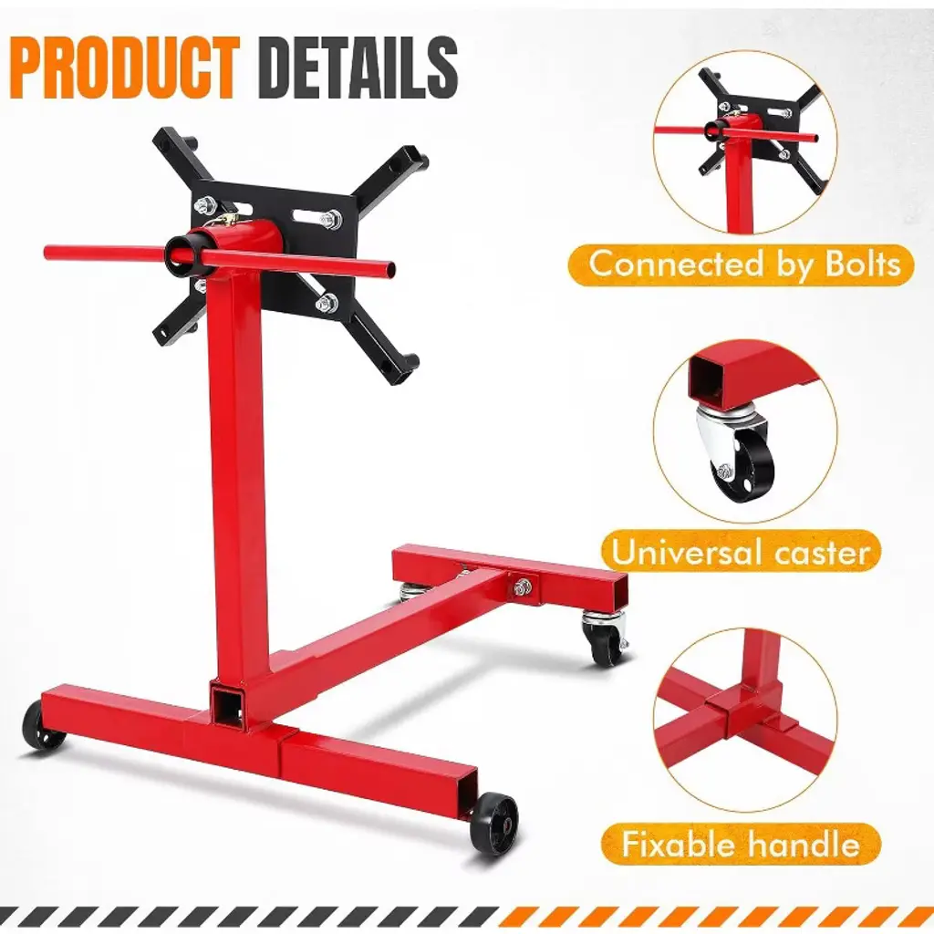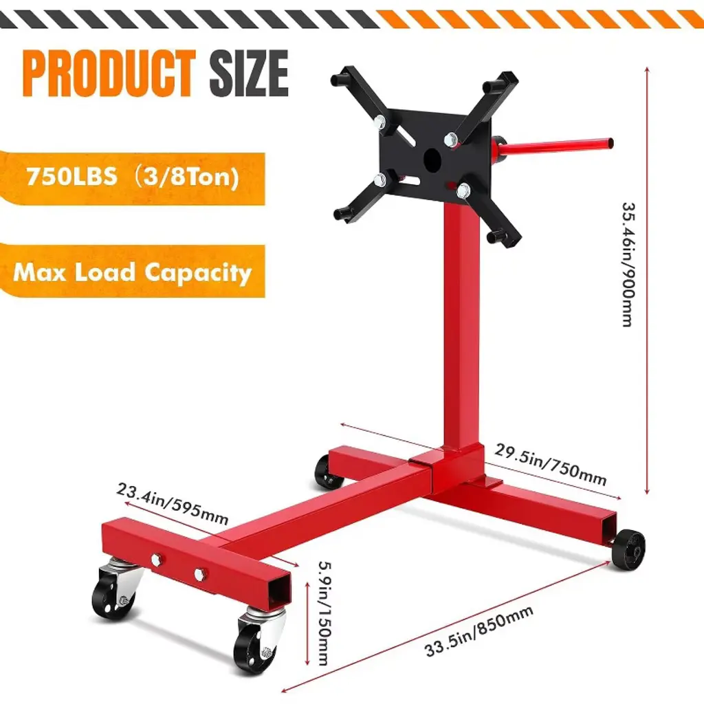 Engine Stand 750 lbs (3/8 Ton) Rotating Engine Motor Stand with 360 Degree Adjustable Head, 4-Caster, 4 Adjustable Arms, Cast Iron Motor Hoist Dolly for Vehicle Maintenance and Auto RepairProduct Description:Experience unparalleled durability and convenience with our 750 lbs Engine Stand, crafted from heavy-duty steel with an industrial finish designed to withstand rigorous use in any garage or workshop. Its extra-wide base ensures maximum stability, allowing you to work confidently and safely on your engine projects.This versatile engine stand features a 360-degree rotating mounting head with four adjustable arms, providing full access to every angle of your engine for efficient rebuilding and maintenance. It securely holds most foreign and domestic engine blocks, making it an tool for professionals and DIY mechanics alike.With a robust load capacity of up to 750 lbs, this engine motor stand supports a wide range of engines, ensuring stability and safety during handling. The stand is equipped with two fixed casters and two 360-degree swivel casters, delivering smooth maneuverability across various workspaces. Easily reposition or transport the stand without hassle, enhancing your workflow and productivity.When not in use, the folding engine stand quickly collapses into a compact size, perfect for saving space in crowded garages or workshops. Its space-saving design allows for convenient storage, so you can keep your workspace organized.Key Features:- Heavy-Duty Steel Construction with Industrial Finish for Long-Lasting Durability- Extra-Wide Base Provides Superior Stability- 360-Degree Rotating Adjustable Head with Four Adjustable Arms for Full Engine Access- Securely Holds Most Foreign and Domestic Engine Blocks- Quick Folding Mechanism for Easy Storage and Space SavingUpgrade your vehicle maintenance and auto repair tasks with this reliable, easy-to-use engine stand built to meet the demands of professionals and enthusiasts alike.