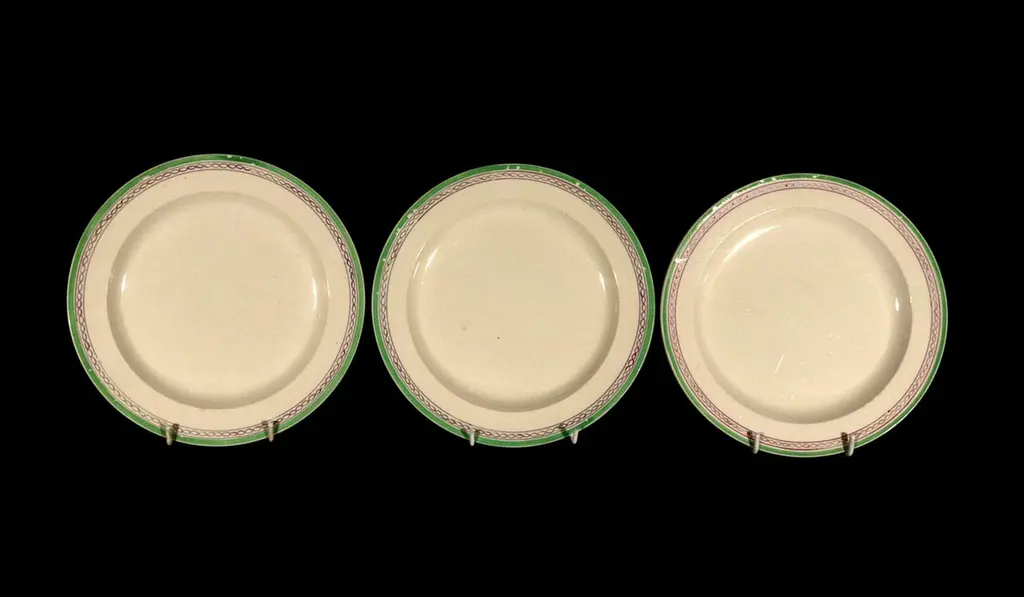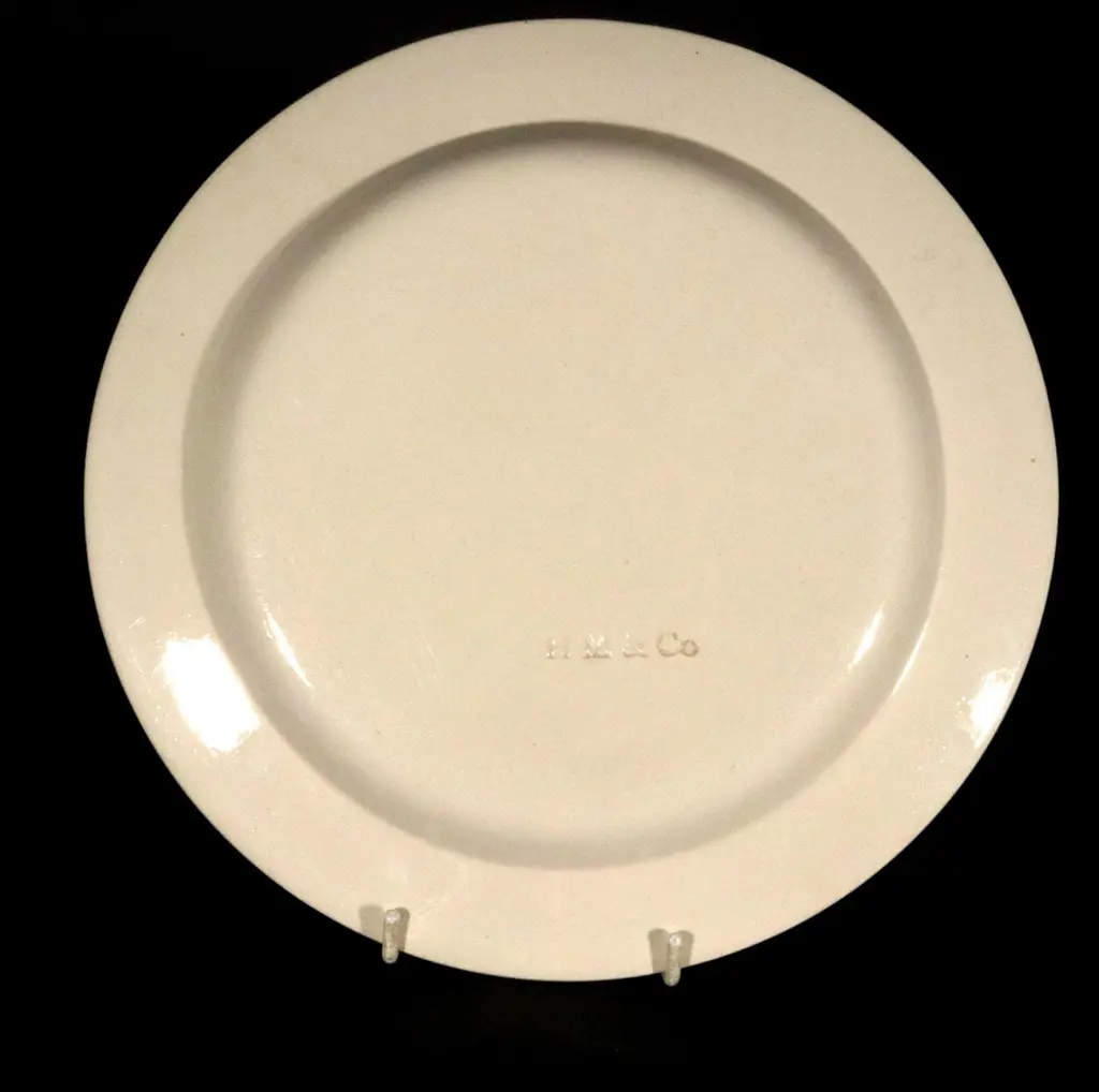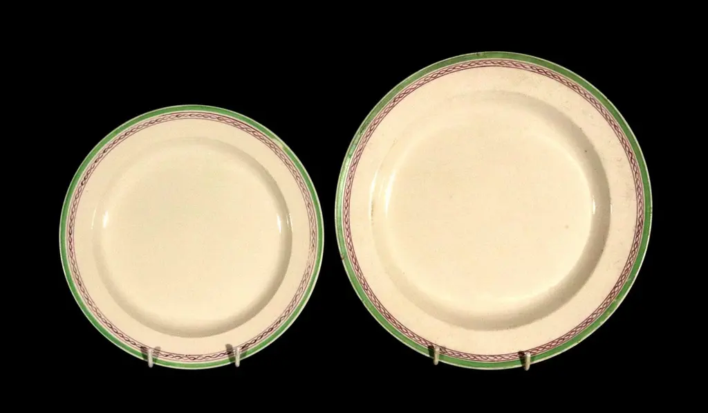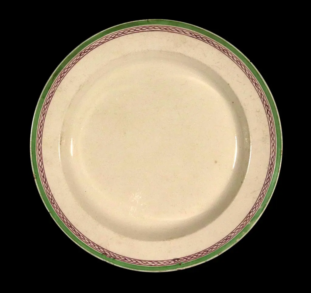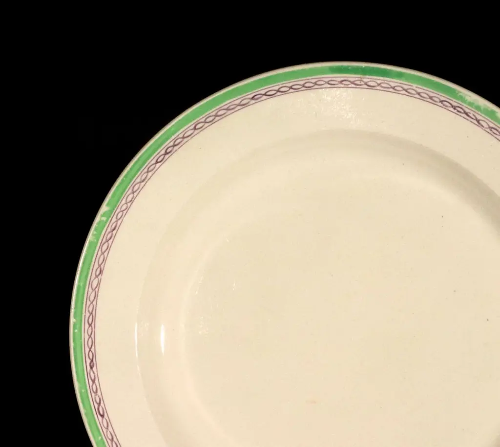 Neoclassical Refinement: Hicks, Meigh & Co. Creamware Service:A Set of Simple Elegance: English Creamware, Circa 1822–1835.This extensive English Creamware Dessert Service, comprising twenty-one pieces, is a wonderful representation of refined earthenware production from the early 19th century, manufactured by Hicks, Meigh & Co. of Staffordshire. Dating between approximately 1822 and 1835, the service showcases a decorative simplicity consistent with the late Neoclassical or early Victorian aesthetic.The appeal of the set lies in its use of bold color and clean lines. The center of each piece is left undecorated, drawing focus to the elegant border design, which features two distinct bands:Outer Rim: A substantial, uniform band of smooth green painted enamel.Inner Band: A finely detailed purple rope-twist motif, neatly framed above and below by thin purple lines.The contrast between the soft, creamy-white glaze of the earthenware and the vibrant green and subtle purple of the hand-painted bands gives the service its sophisticated charm.Historical Context and MakerThe set bears the mark "HM & Co." on some pieces, identifying the manufacturer as Hicks, Meigh & Co., a significant Staffordshire pottery operating during the first half of the 19th century. Creamware, first popularized by Josiah Wedgwood, remained a widely popular and versatile material, allowing for both everyday utility and decorative refinement.This set is a comprehensive service, consisting of:Twelve Side or Dessert Plates (8 1/4 inches diameter)Nine Dinner Plates (9 3/4 inches diameter)The condition, with minor flaking to the green enamel invisibly repaired on several pieces, is typical for painted earthenware of this age and speaks to the use and value that this elegant service held over two centuries. The set is a functional artifact of dining history, reflecting the popular taste for clean forms accented by bright enamel colors during the Regency and early Victorian periods.(Ref: NY8650-nmrr)