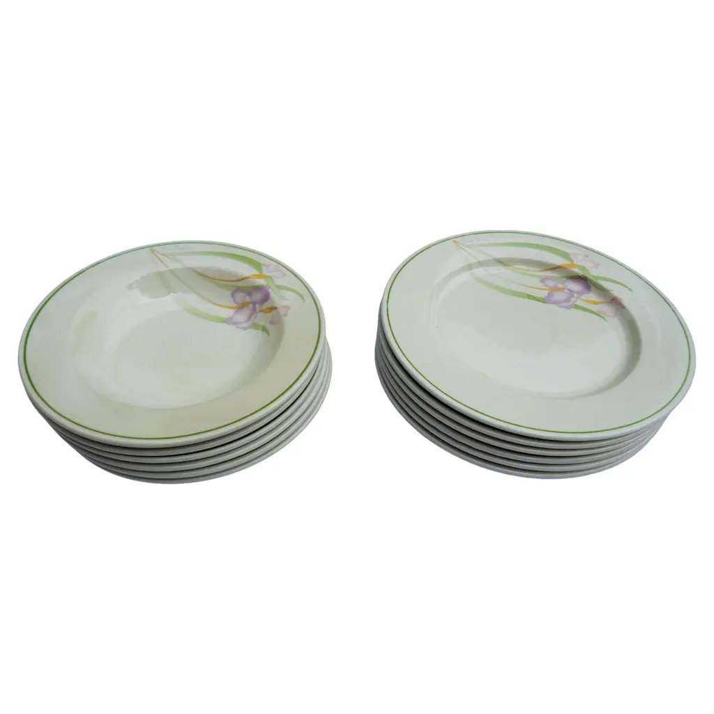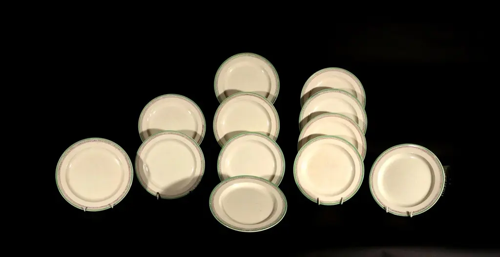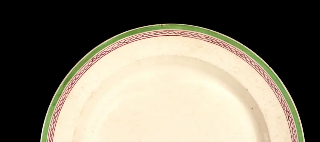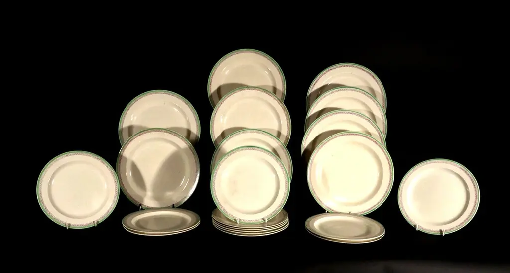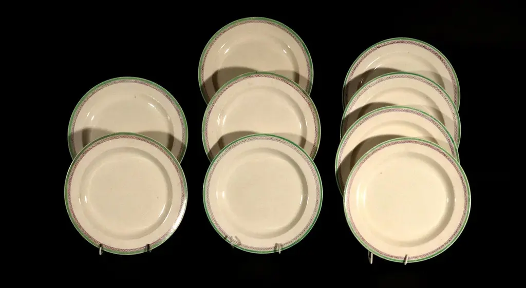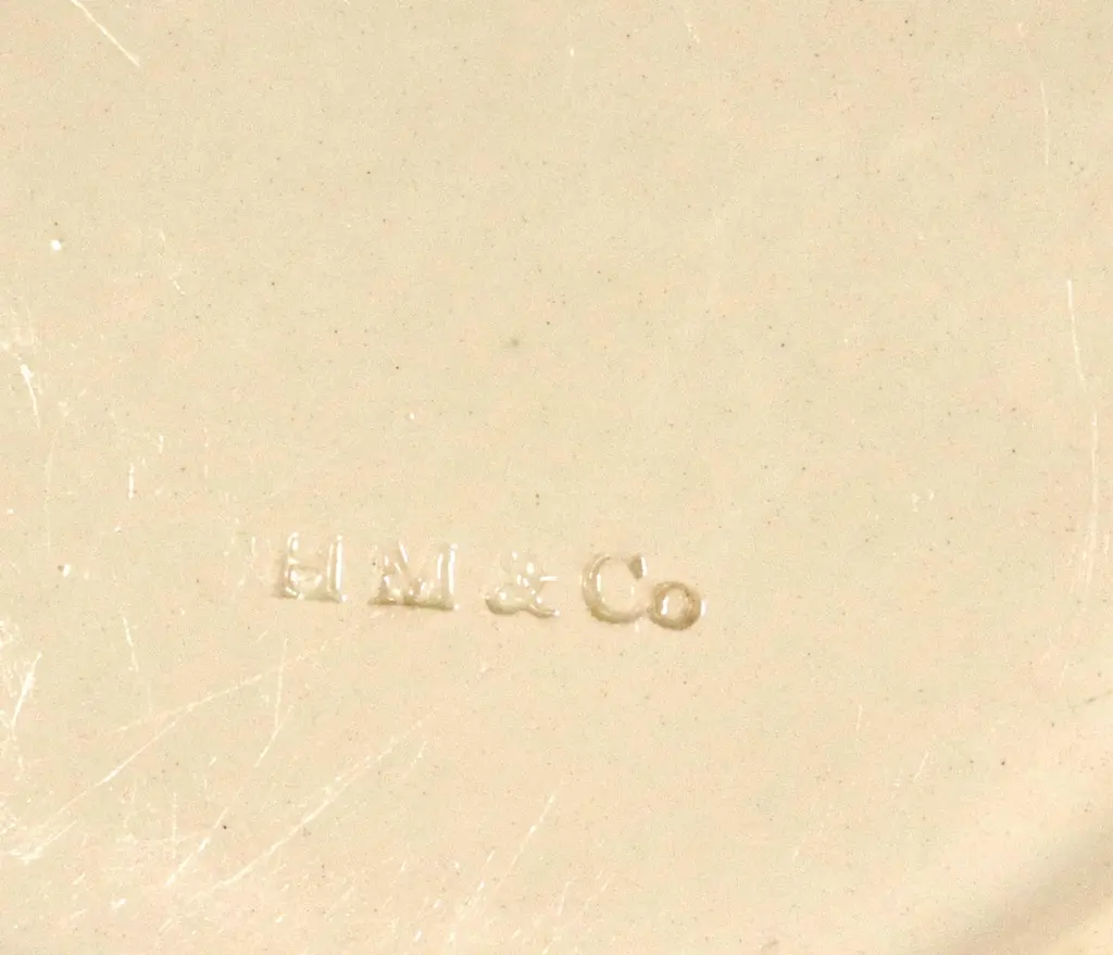 Neoclassical Refinement: Hicks, Meigh & Co. Creamware Service:A Set of Simple Elegance: English Creamware, Circa 1822–1835.This extensive English Creamware Dessert Service, comprising twenty-one pieces, is a wonderful representation of refined earthenware production from the early 19th century, manufactured by Hicks, Meigh & Co. of Staffordshire. Dating between approximately 1822 and 1835, the service showcases a decorative simplicity consistent with the late Neoclassical or early Victorian aesthetic.The appeal of the set lies in its use of bold color and clean lines. The center of each piece is left undecorated, drawing focus to the elegant border design, which features two distinct bands:Outer Rim: A substantial, uniform band of smooth green painted enamel.Inner Band: A finely detailed purple rope-twist motif, neatly framed above and below by thin purple lines.The contrast between the soft, creamy-white glaze of the earthenware and the vibrant green and subtle purple of the hand-painted bands gives the service its sophisticated charm.Historical Context and MakerThe set bears the mark "HM & Co." on some pieces, identifying the manufacturer as Hicks, Meigh & Co., a significant Staffordshire pottery operating during the first half of the 19th century. Creamware, first popularized by Josiah Wedgwood, remained a widely popular and versatile material, allowing for both everyday utility and decorative refinement.This set is a comprehensive service, consisting of:Twelve Side or Dessert Plates (8 1/4 inches diameter)Nine Dinner Plates (9 3/4 inches diameter)The condition, with minor flaking to the green enamel invisibly repaired on several pieces, is typical for painted earthenware of this age and speaks to the use and value that this elegant service held over two centuries. The set is a functional artifact of dining history, reflecting the popular taste for clean forms accented by bright enamel colors during the Regency and early Victorian periods.(Ref: NY8650-nmrr)