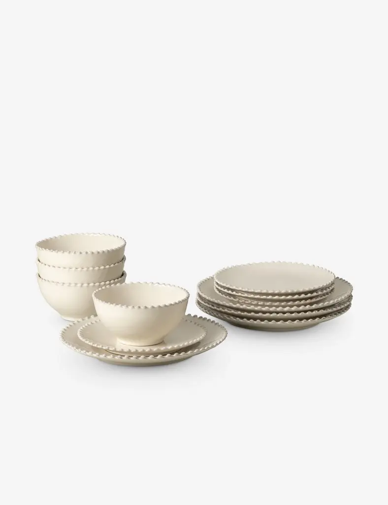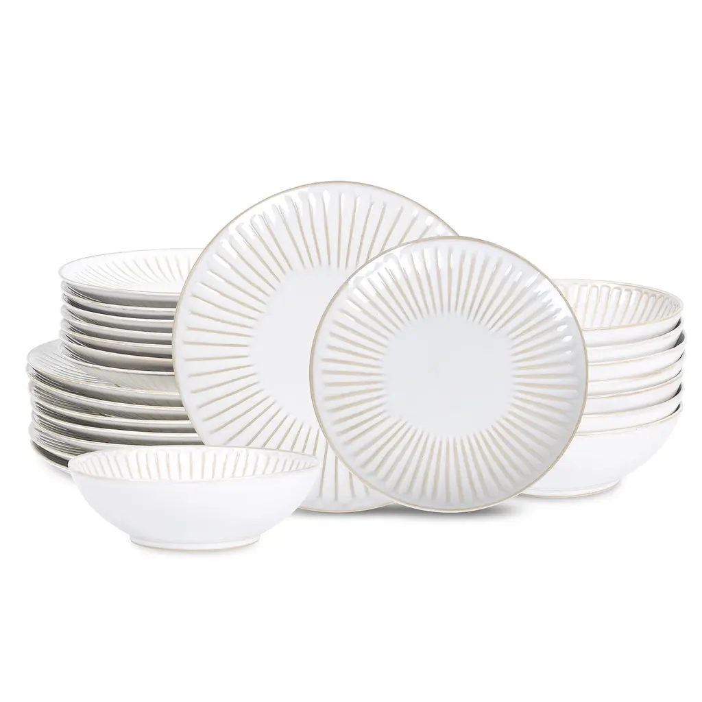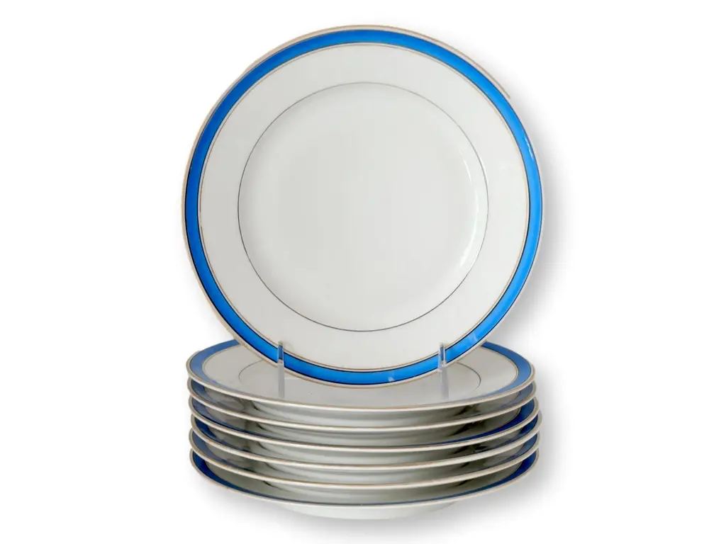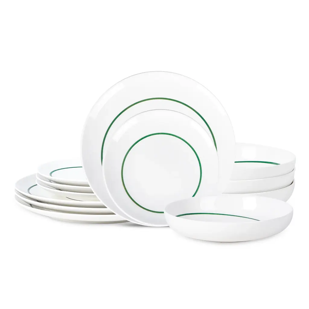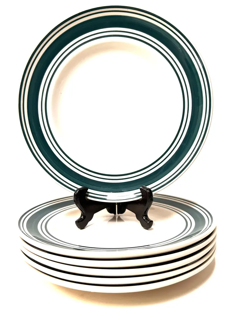 Neoclassical Refinement: Hicks, Meigh & Co. Creamware Service:A Set of Simple Elegance: English Creamware, Circa 1822–1835.This extensive English Creamware Dessert Service, comprising twenty-one pieces, is a wonderful representation of refined earthenware production from the early 19th century, manufactured by Hicks, Meigh & Co. of Staffordshire. Dating between approximately 1822 and 1835, the service showcases a decorative simplicity consistent with the late Neoclassical or early Victorian aesthetic.The appeal of the set lies in its use of bold color and clean lines. The center of each piece is left undecorated, drawing focus to the elegant border design, which features two distinct bands:Outer Rim: A substantial, uniform band of smooth green painted enamel.Inner Band: A finely detailed purple rope-twist motif, neatly framed above and below by thin purple lines.The contrast between the soft, creamy-white glaze of the earthenware and the vibrant green and subtle purple of the hand-painted bands gives the service its sophisticated charm.Historical Context and MakerThe set bears the mark "HM & Co." on some pieces, identifying the manufacturer as Hicks, Meigh & Co., a significant Staffordshire pottery operating during the first half of the 19th century. Creamware, first popularized by Josiah Wedgwood, remained a widely popular and versatile material, allowing for both everyday utility and decorative refinement.This set is a comprehensive service, consisting of:Twelve Side or Dessert Plates (8 1/4 inches diameter)Nine Dinner Plates (9 3/4 inches diameter)The condition, with minor flaking to the green enamel invisibly repaired on several pieces, is typical for painted earthenware of this age and speaks to the use and value that this elegant service held over two centuries. The set is a functional artifact of dining history, reflecting the popular taste for clean forms accented by bright enamel colors during the Regency and early Victorian periods.(Ref: NY8650-nmrr)