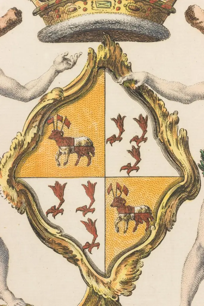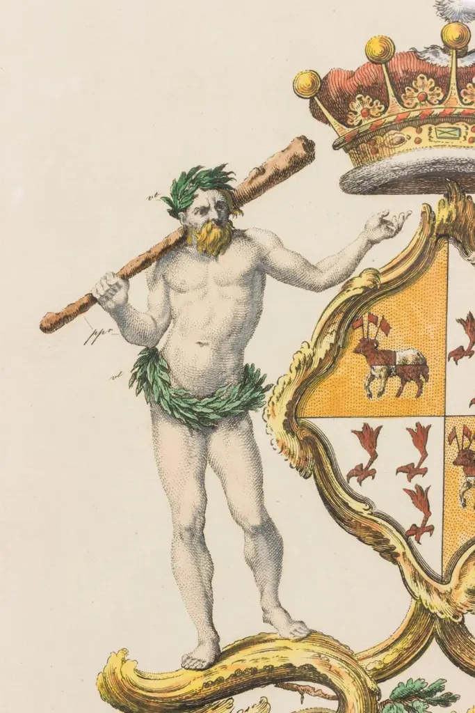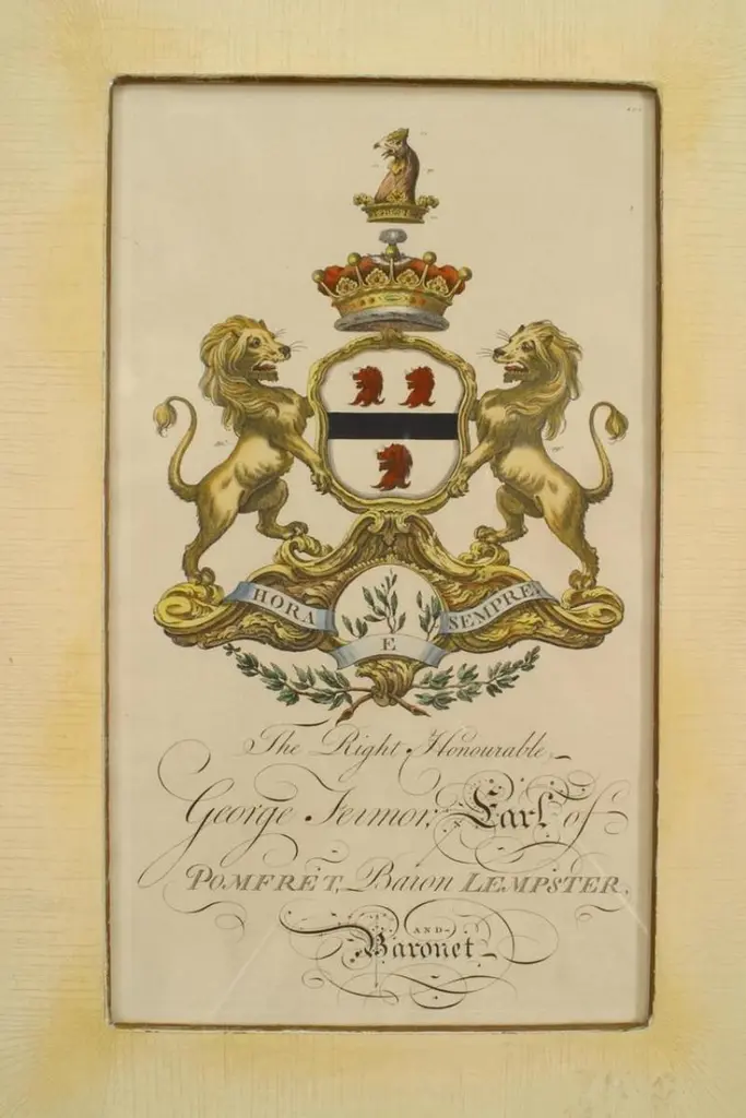 5 English Georgian (18th Cent) hand-colored copper plate engravings of coat of arms in orange with gold trimmed frames (by Joseph Edmondson, 1770) (PRICED EACH)
