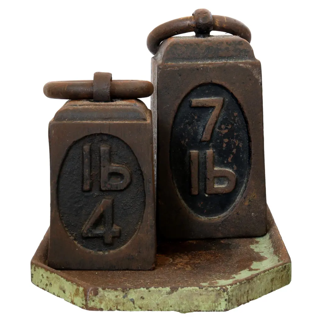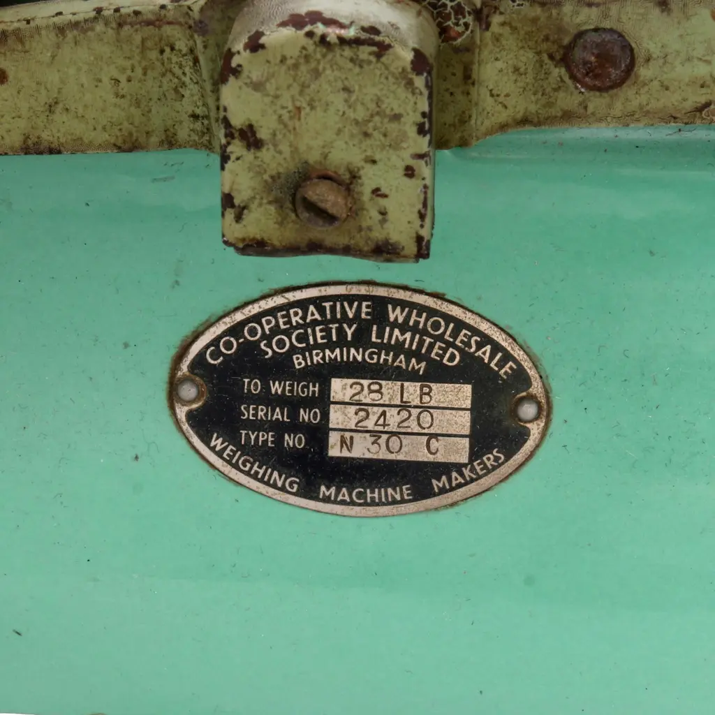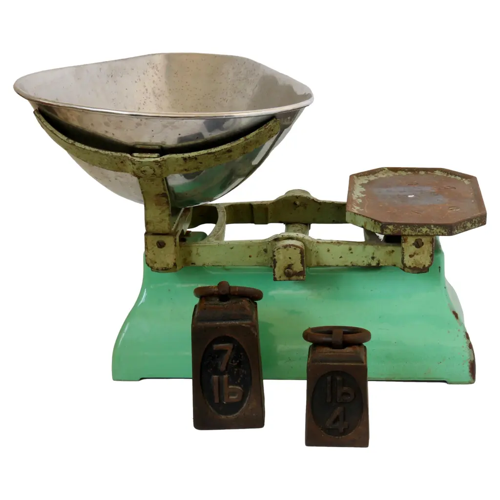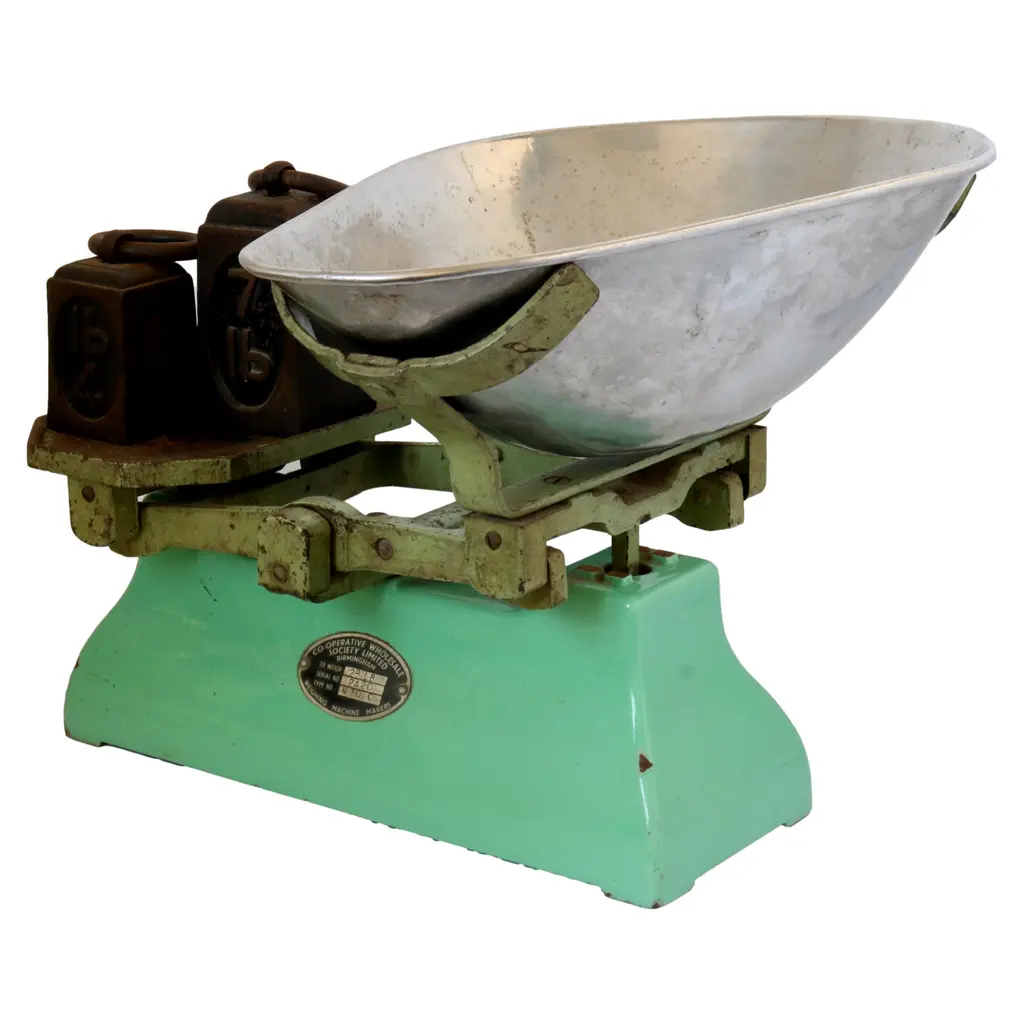 Heavy duty English produce/grocery scale with two large weights. Manufacturer's tag on base.