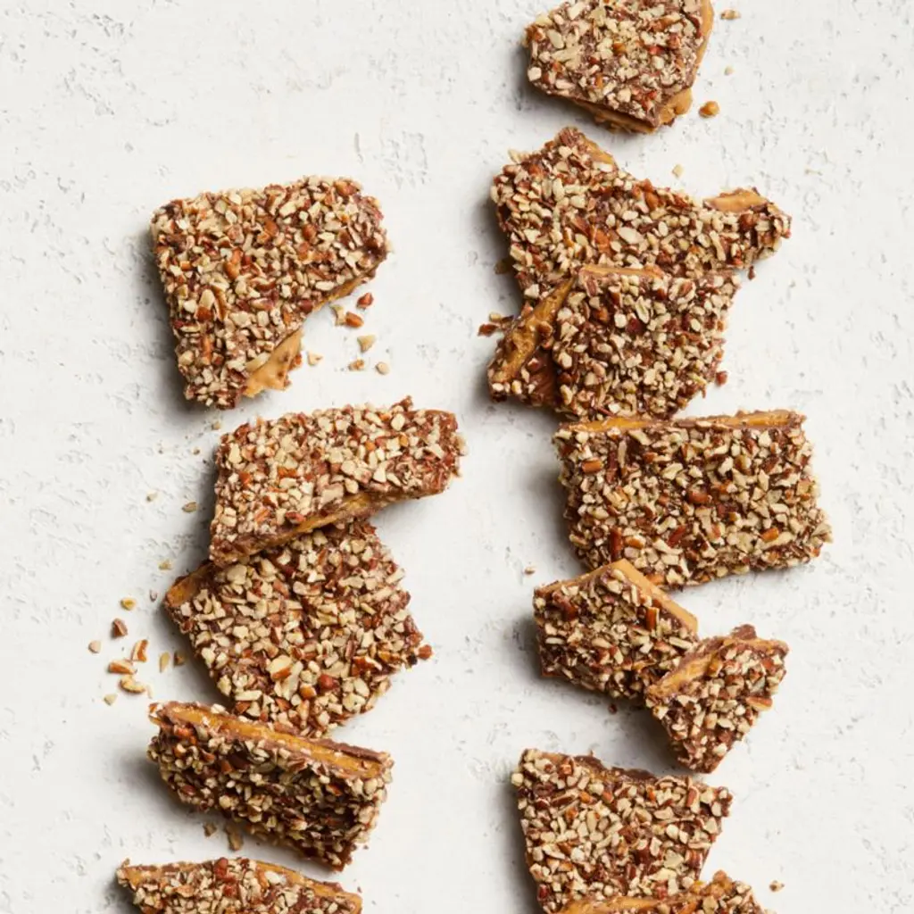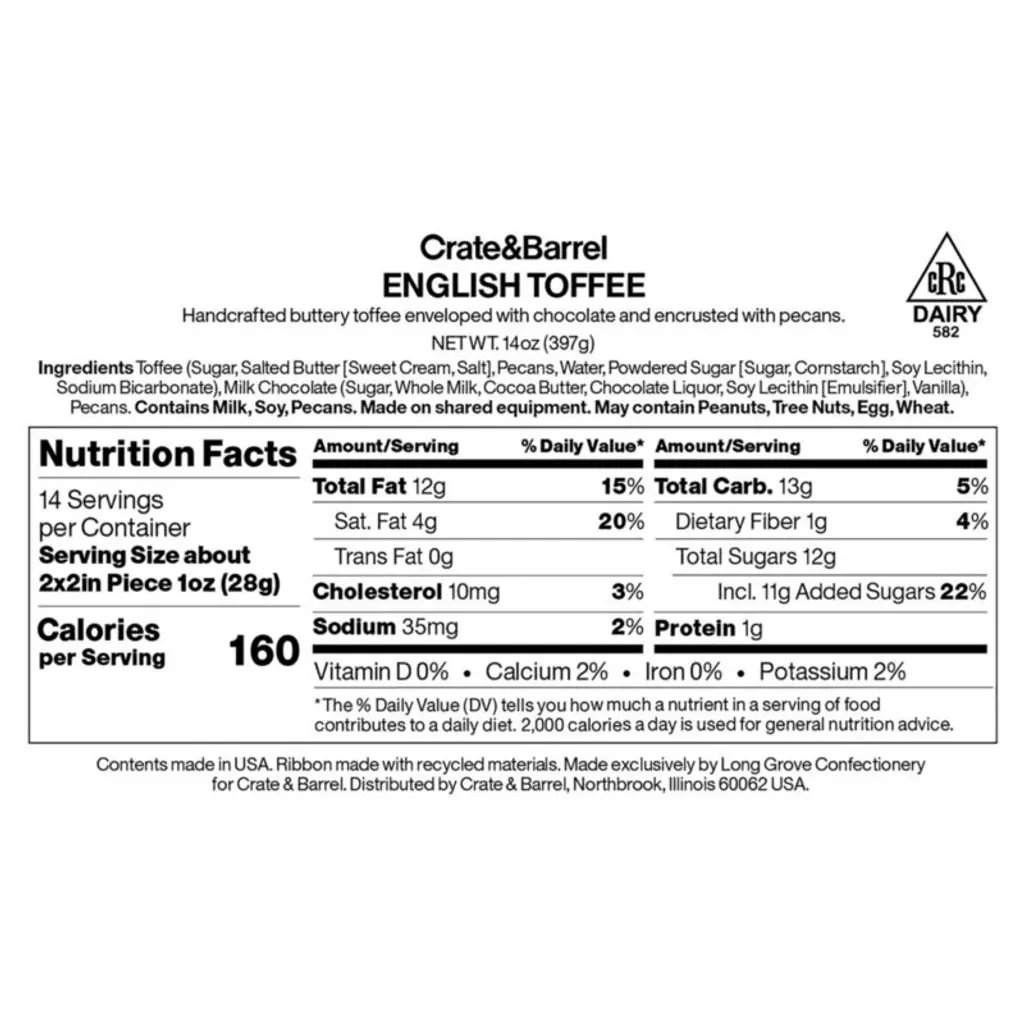 Enjoy the timeless deliciousness of English toffee. Made with a time-tested recipe, our toffee tempts with a crisp almond toffee center, rich milk chocolate and roasted and salted pecans. The gift-ready, ribbon-wrapped tin is ideal for hosts, hostesses and unexpected guests.