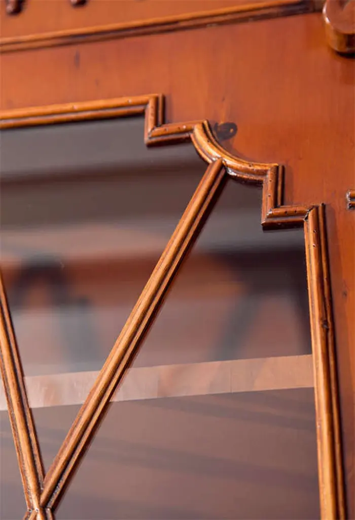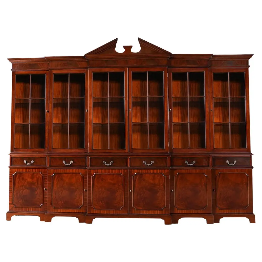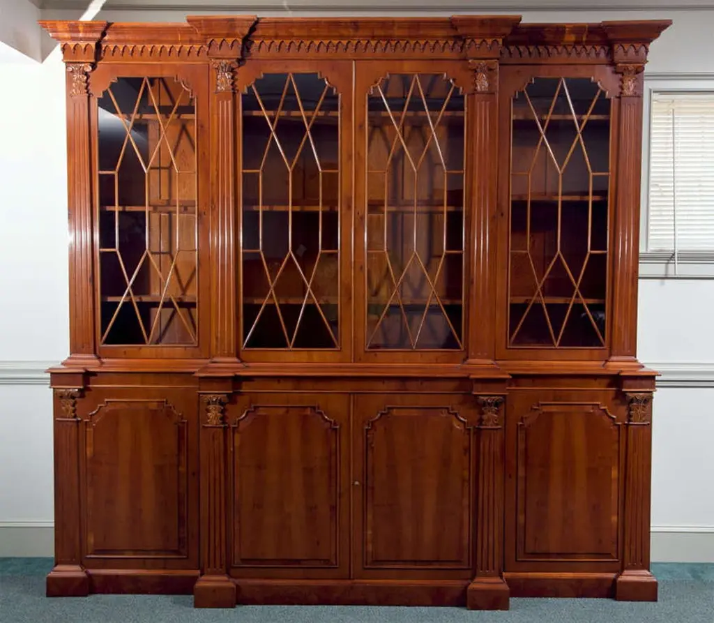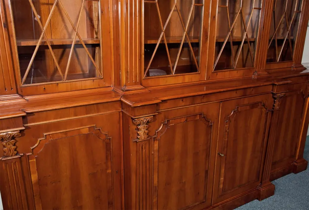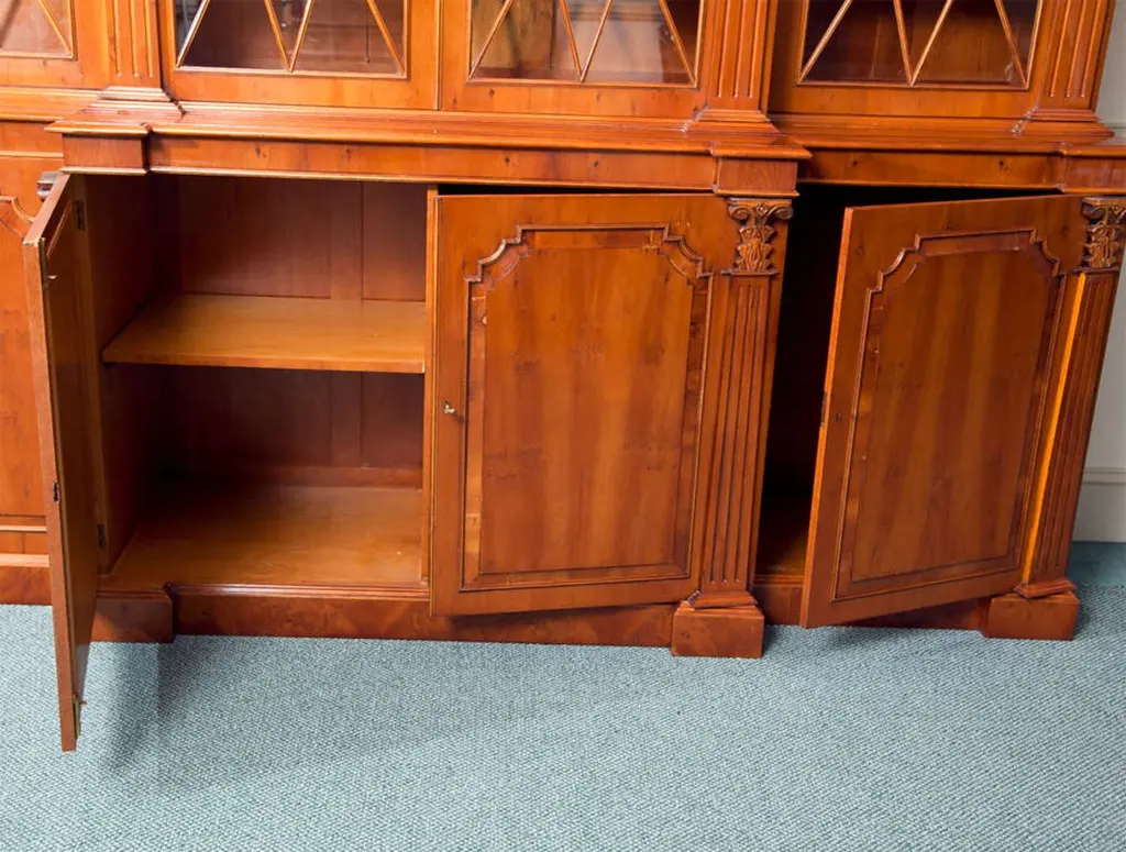 Custom made for us in England by talented craftsmen, this classically styled Georgian breakfront with columnar accents has a presence that is unmatched by many of today's bookcases and display cabinets. The rich, honey tone of yew wood affords this breakfront a hue that can blend well with just about any other wood, from oak to fruitwood--or even an antique faded mahogany--while the classic lines look as well with antiques as they do with modern interiors.