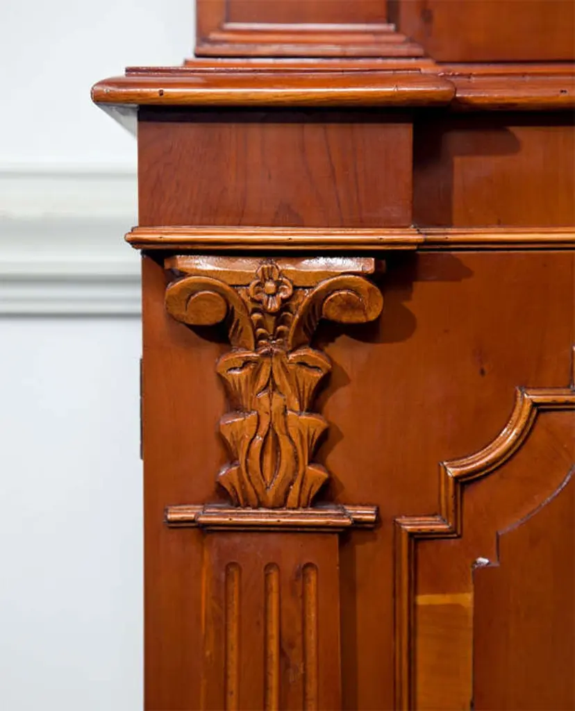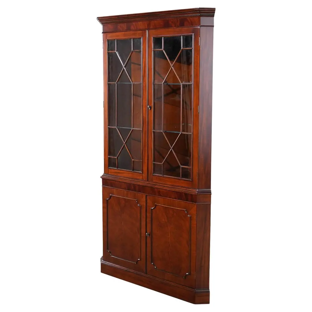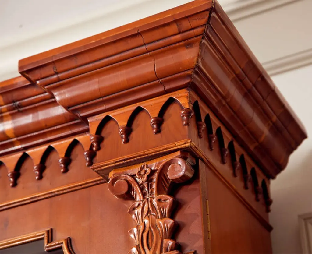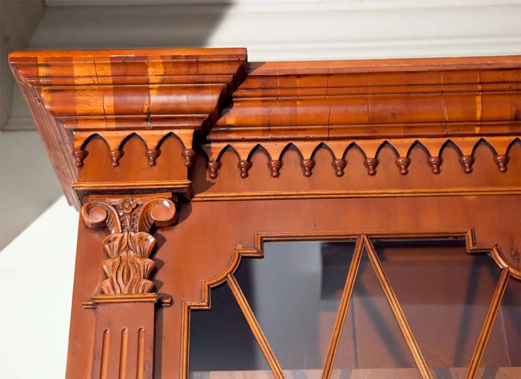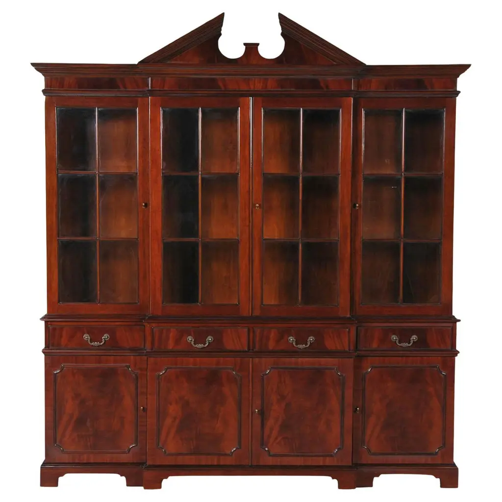 Custom made for us in England by talented craftsmen, this classically styled Georgian breakfront with columnar accents has a presence that is unmatched by many of today's bookcases and display cabinets. The rich, honey tone of yew wood affords this breakfront a hue that can blend well with just about any other wood, from oak to fruitwood--or even an antique faded mahogany--while the classic lines look as well with antiques as they do with modern interiors.