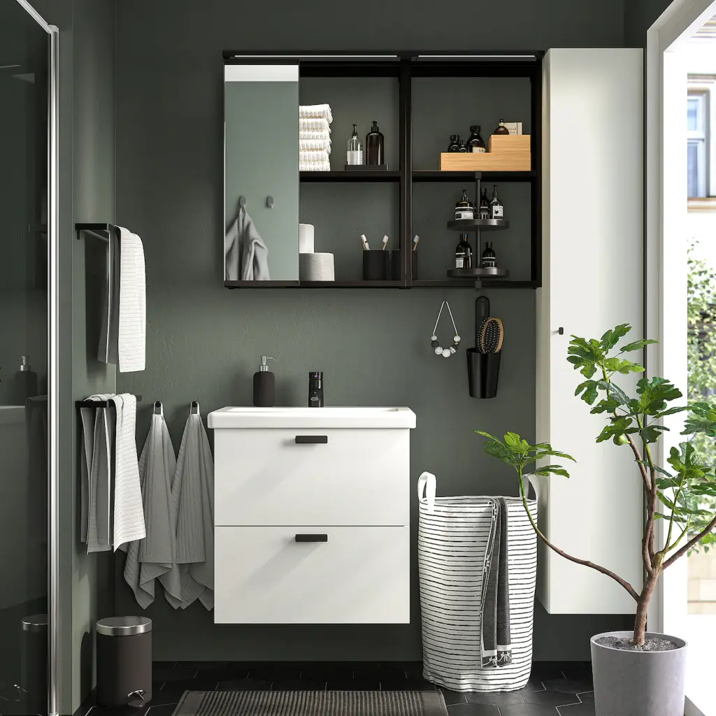 ENHET Bathroom - anthracite/white 24 ". With white doors and drawer fronts you create a clean, bright and fresh expression that you can match with accents in all colors of the rainbow. Easy to enjoy and always in style. Knob or handle sold separately.