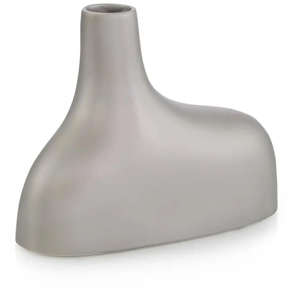 The Enigma Vessel is a tasteful, abstract accent piece in a gray finish. Crafted from ceramic, the piece features a rounded profile with a tapered rim. The compact, rounded nature of the piece allows it to fit neatly within the larger Enigma Vessel, creating a stacked look that greatly elevates an interior space.