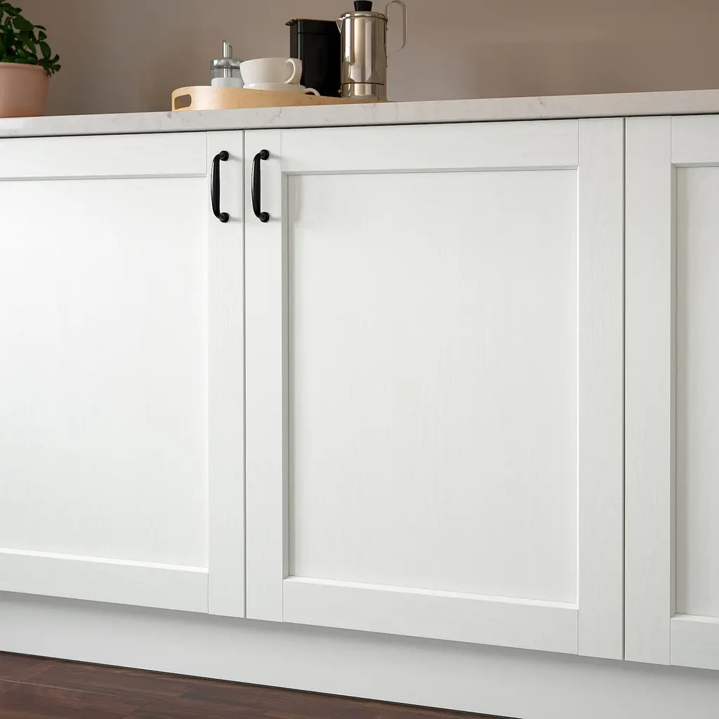 ENKÖPING Door - white wood effect 21x30 ". Foil gives a smooth and practical surface that is resistant to moisture and staining and is easy to clean. 25-year Limited Warranty. Read about the terms in the Limited Warranty brochure. You can choose to mount the door on the right or left side.