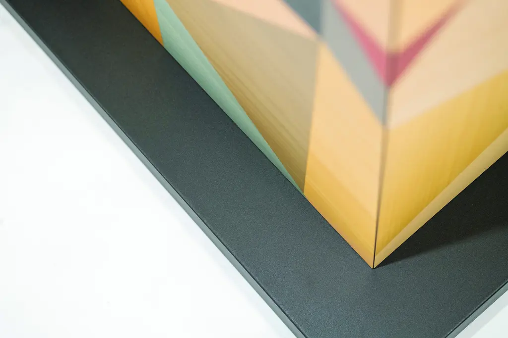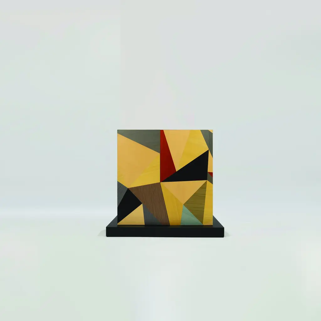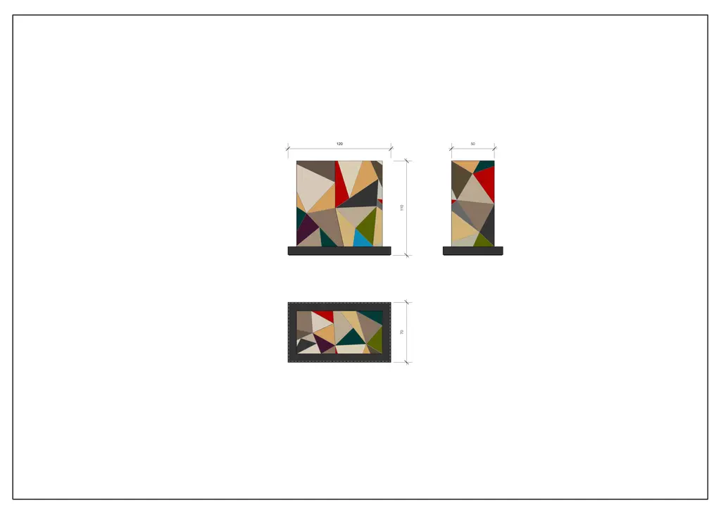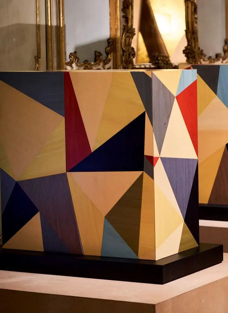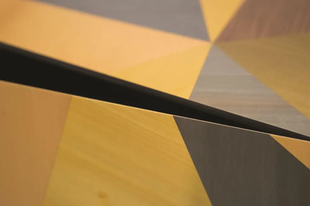 Sicily is not only classical and baroque architecture, but also modern and contemporary art. The futurist period, in addition to some works by Fortunato Depero inspired by the main Sicilian cities, has left some masterpieces such as the incredible frescoes by Benedetta Cappa Marinetti in the rooms of the Palazzo delle Poste in Palermo. Enna is a series of containers with a totemic presence, which can be placed freely thanks to the finish present on the five visible sides. In fact, a polychrome wooden marquetry that recalls the avant-garde of the early twentieth century but also the decorative language of radical design or the early eighties covers, thanks to a work of high ebonistery, all sides of the cabinet. The refined woodworking is therefore declined in a sample of minimal design that as a means of expression uses the language of color / texture of natural wood or aniline stained. Vertical container with structure in oak blockboard, varnished on the inside with an open pore smoke grey finish, side fronts and backs in oak blockboard plated with inlays of polychrome wood, mass-dyed with a water-based finish. Base in black matt lacquered blockboard. Version ENNA B cm 220x 110 H x 70