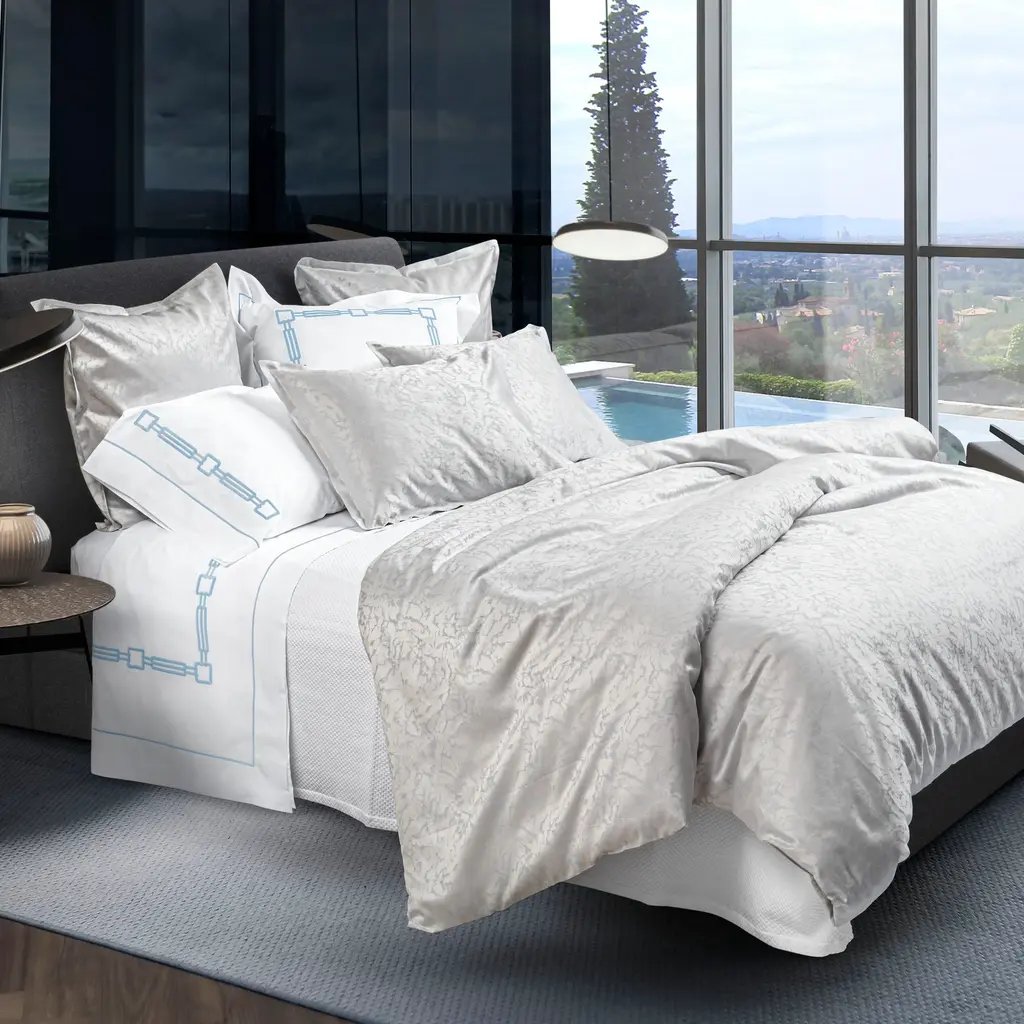 Discover the Enna Duvet & Sham by Signoria Firenze. Evoking rays of sunlight filtered through forest branches, this exquisite set is an elevating addition to any bedroom. Woven in Italy in soft extra-long staple cotton Jacquard with a 500 t.c. The Enna Duvet reverses to solid cotton sateen with a 300 t.c. Choose from two sophisticated colorways. Duvet available in Twin, Queen, and King sizes. Shams offered in Standard, King, Euro, Super Euro, and Boudoir.