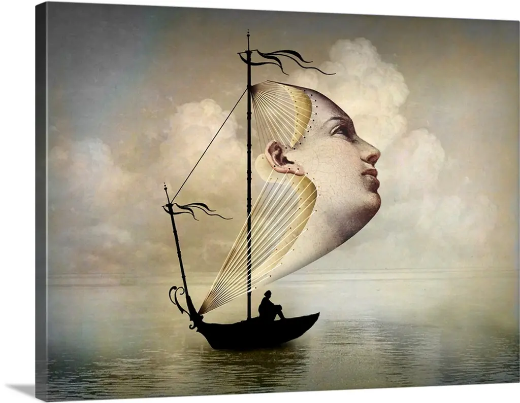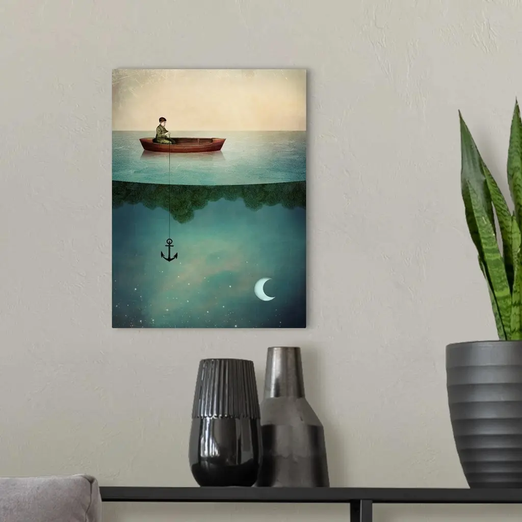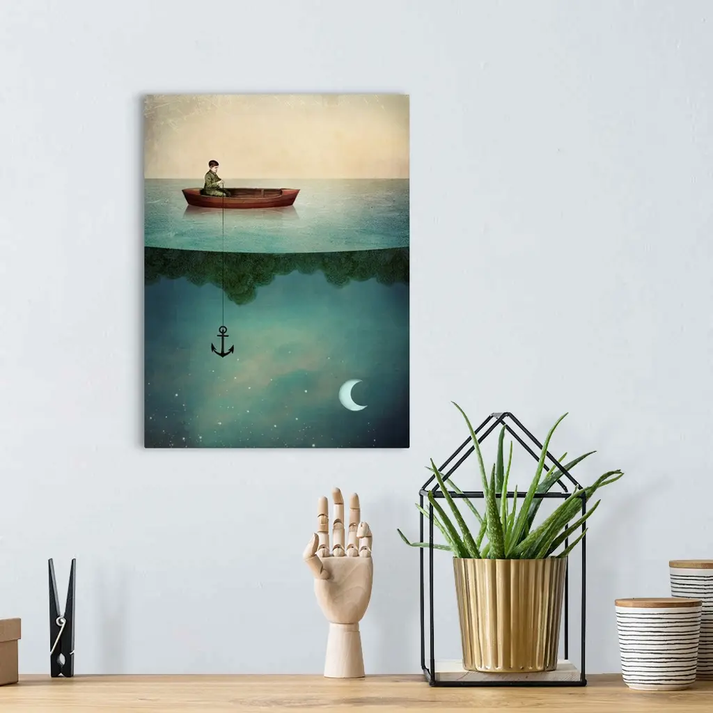 A digital abstract composite of a young boy on a boat with the moon light sky in the water.