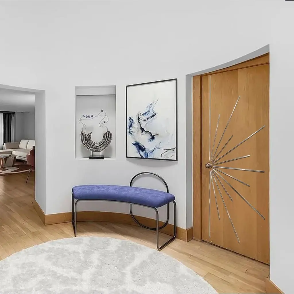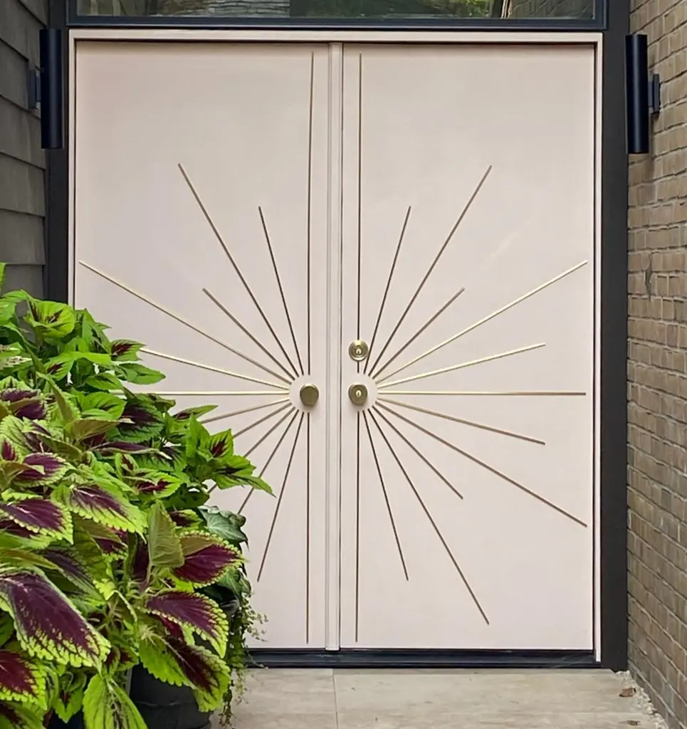 Produced for clients not wishing to purchase out doors directly and to provide their own extant or newly purchased door for a modern look For use on exterior or interior doors. For apartments, HOA may inhibit the exterior of your doors from being altered, but these bars will greatly enhance your interior door to make it an art statement and are allowed. Stainless Steel has a near indefinite life. our brass is warrantied for 1 year with a finish applied and is for interior use. You can request "living finish" for brass with no coating that will patina with age and use for interior or exteriors. If you request a clear coat for an exterior brass kit, it will not have a warranty due to differing exterior conditions.Each kit is produced to fit your door and a questionnaire is issued upon purchase and your kit is produced to the maximum allowable width and height with consideration to your hardware/We have 2 listings for either single or double doors. This listing is for the double door pattern. We produce the kit for doors up to 40" wide and 96" in height, with kits over 96" tall being Price On Request. The kit attaches through a special adhesive which will not be able to be removed except with the use of very strong force, so they are permanent in the sense they will not come off, but can be removed down the line if absolutely required.The material is either 100% solid architectural grade brass or Marine Stainless Steel - pipe is not used. The finish is genuine metal, not a painted surface. Pictured are some applications of the modernist design. Each kit includes a template to assist with application.Perfect for new construction or existing doors providing curb appeal through ornament of our door decorative hardware. Perfect for retro fits of Mid-Century Modern homes and businesses. Stainless Steel bars match Stainless Steel door lock handle/knob hardware, Satin Nickel and Satin Chrome. The Brass matches "Satin Brass" door hardware.