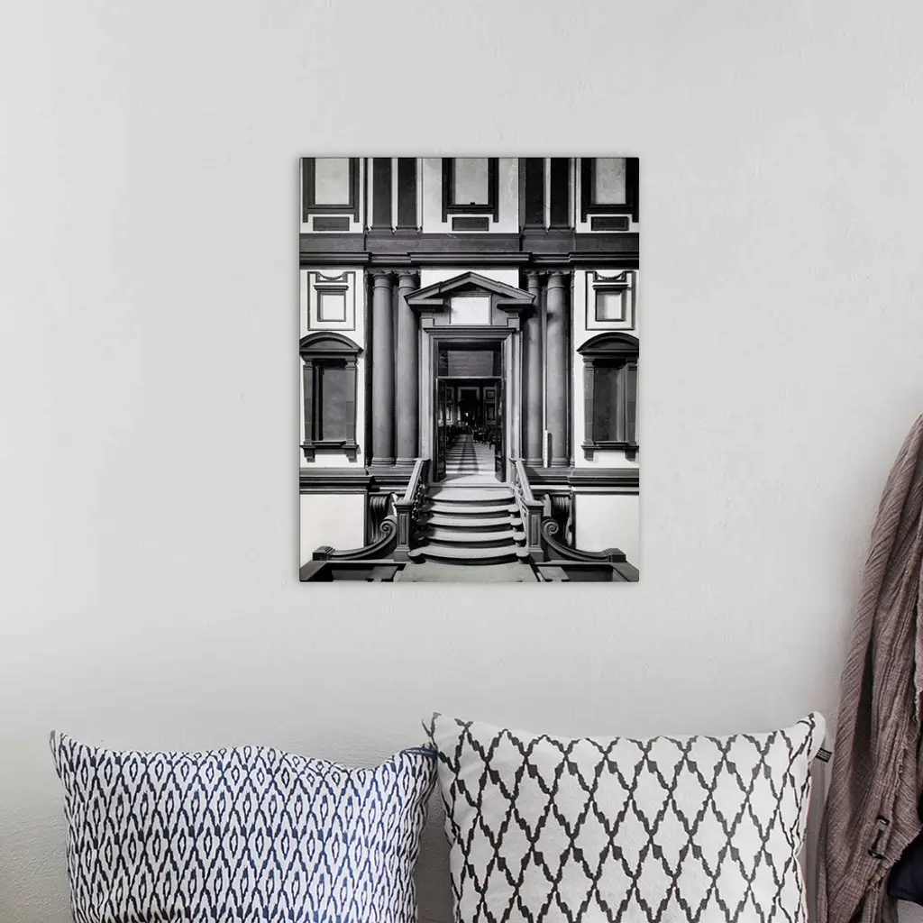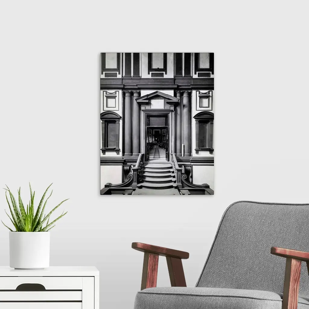 View of the entrance of the Medicean-Laurentian Library from the anteroom. The library was built in the 16th century to house books and manuscripts collected by the Medici family.