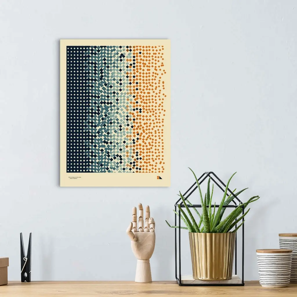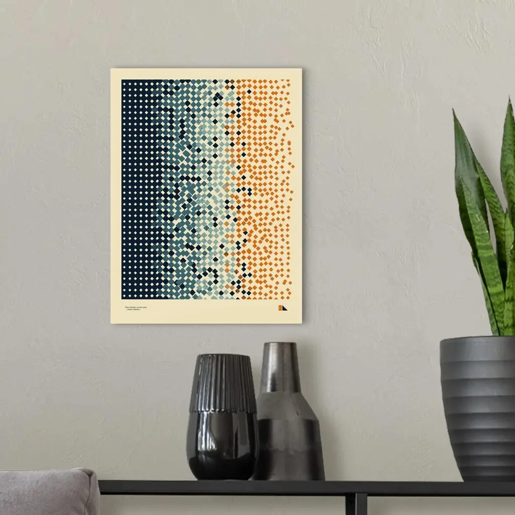 Graphic poster representing entropy made up of orange and blue squares. Quote on the bottom reads: Only entropy comes easy. -Anton Chekhov