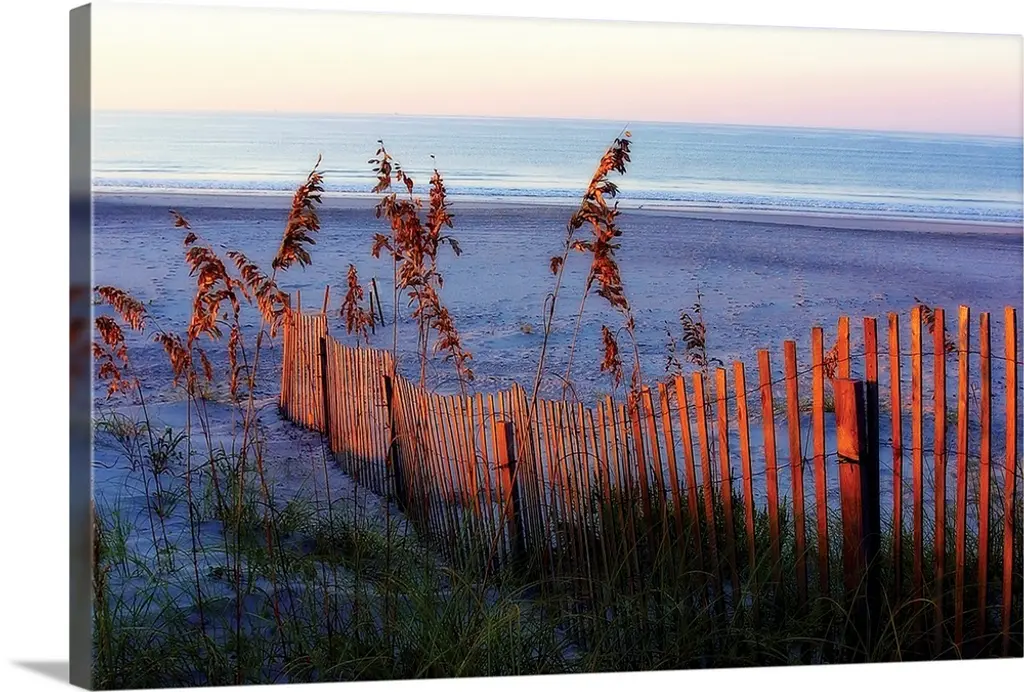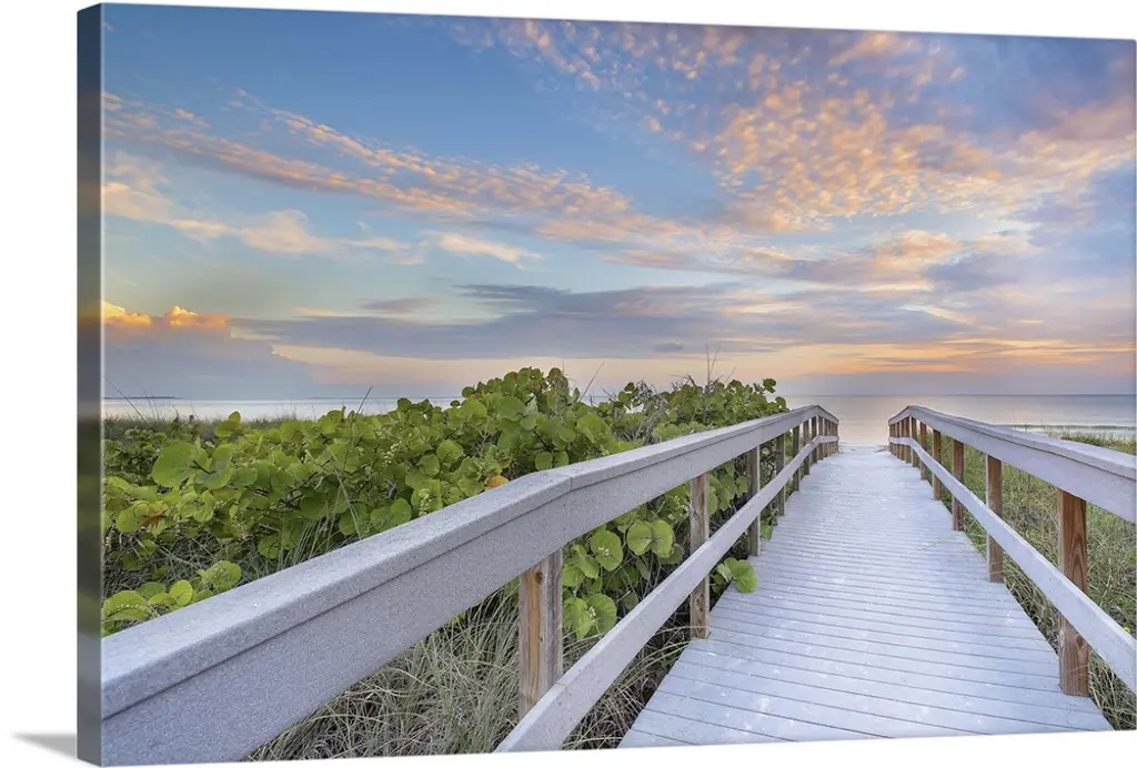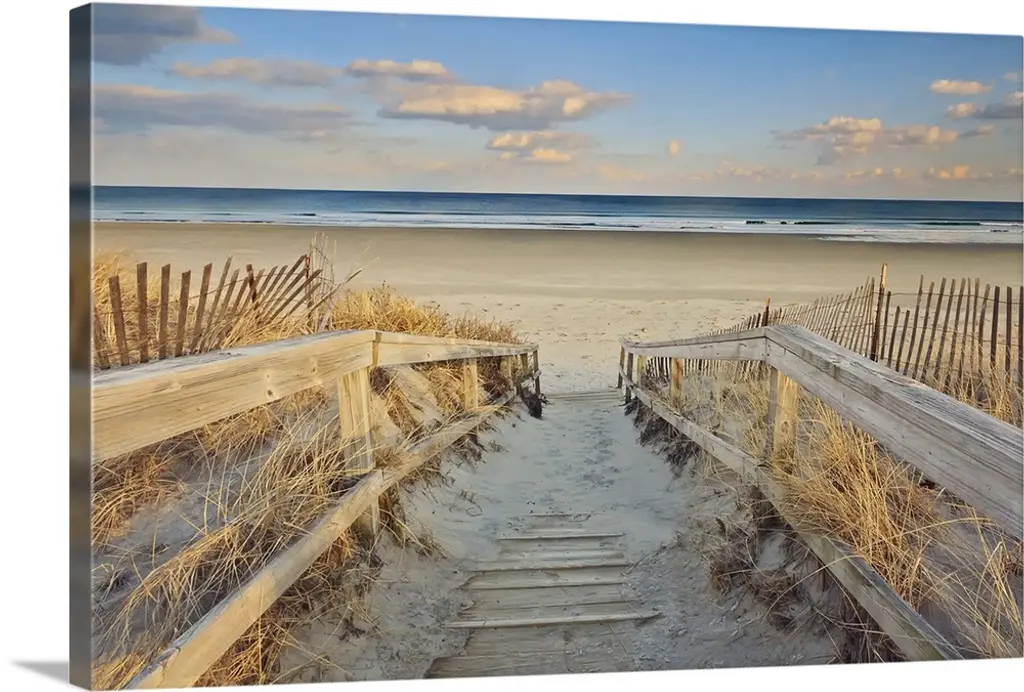 Fenced sandy walkway on St. Augustine Beach at sunset.