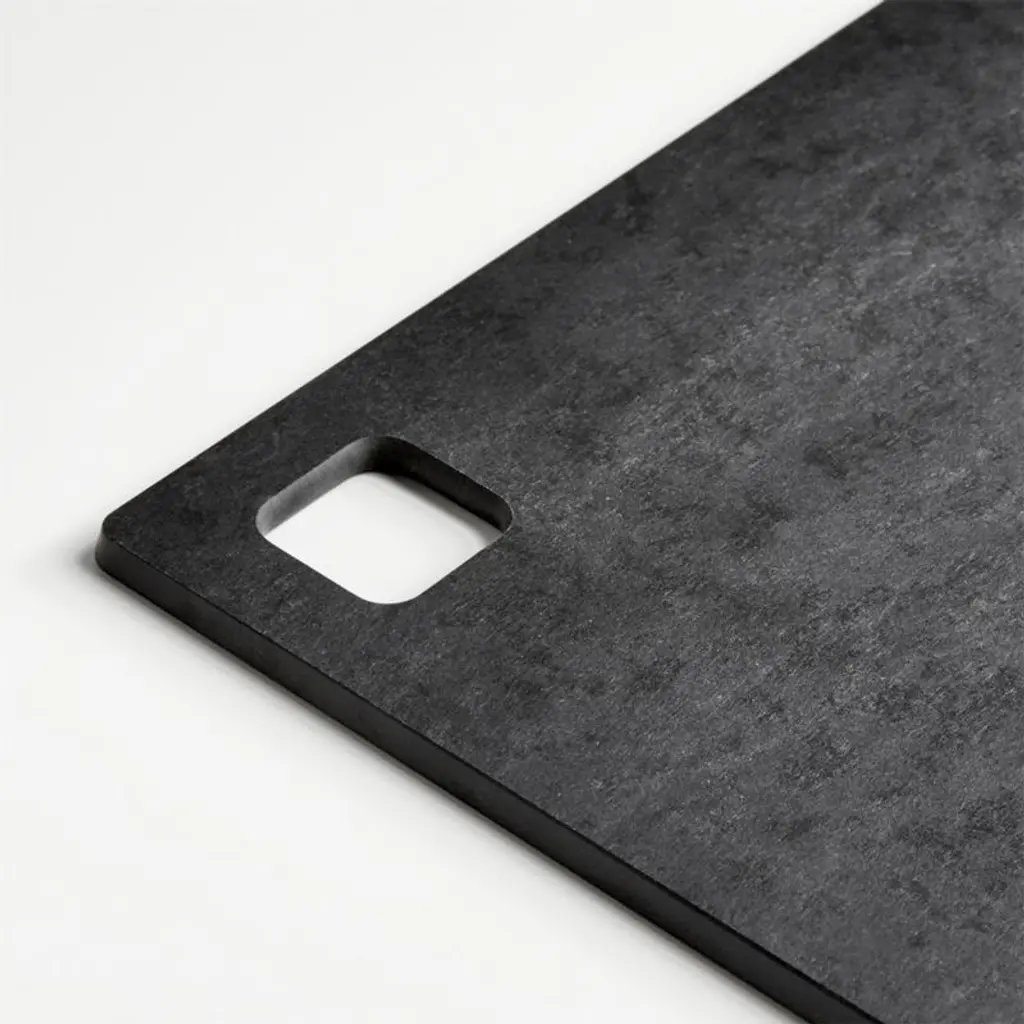 For serving or kitchen prep work, this wood board looks sophisticated in slate gray with a smart square cutout handle. The board is constructed of wood fiber composite, resin-saturated fiber that's compressed and baked to a solid sheet. Strong, lightweight, nonporous, this marvelous material won't scratch, crack, split, or stain, and does not harbor bacteria.